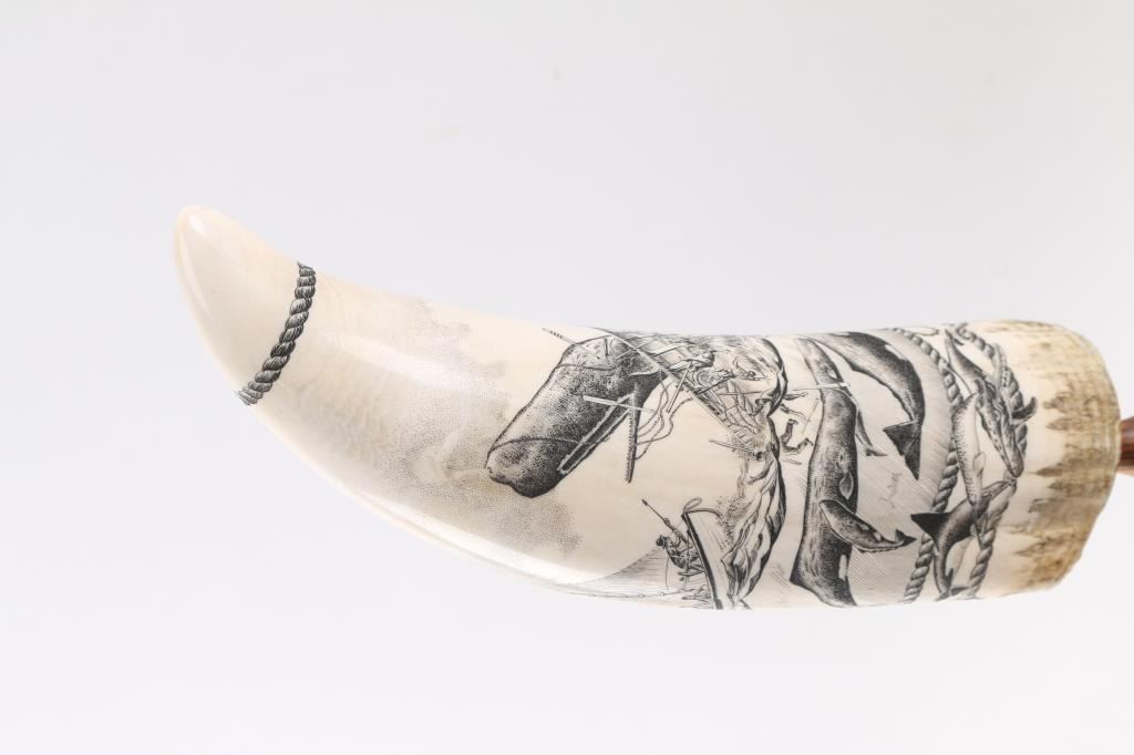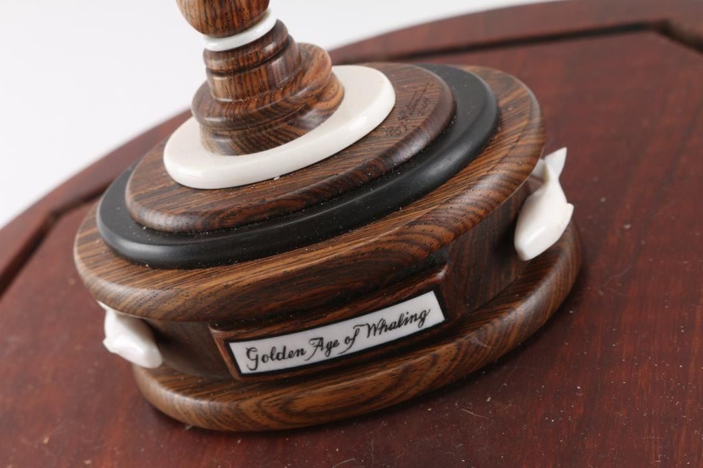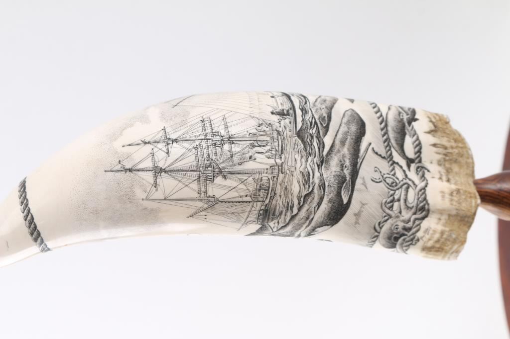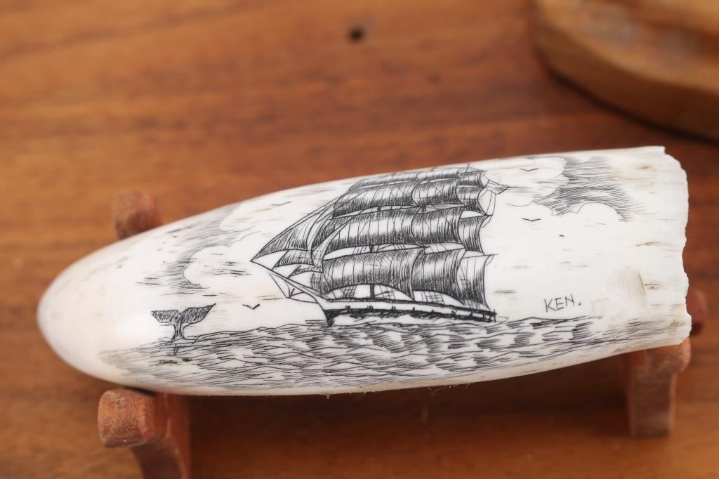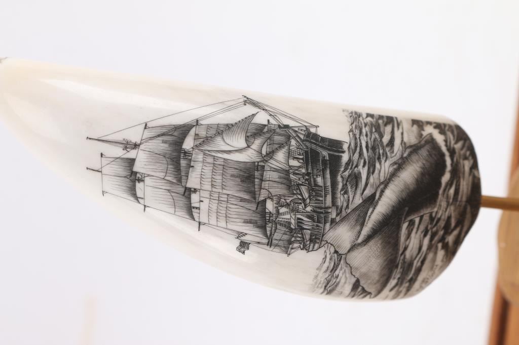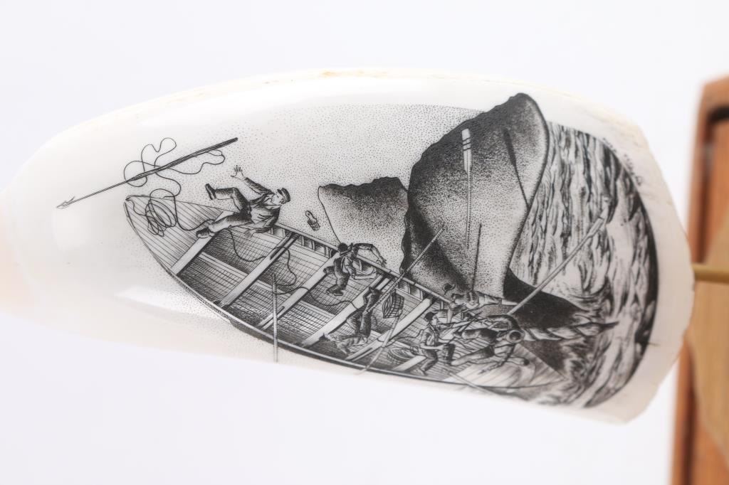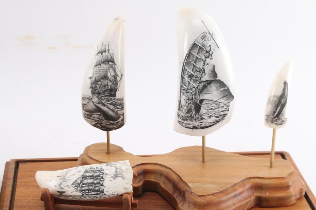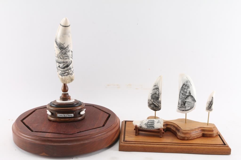 Decorated with sailboats and whales, unsigned. In fancy wood and plexiglass display. One tooth measures 8 1/2". Entitled The Golden Age of Whaling. Plus four others in glass display. One reads American Whale Ship Bark.