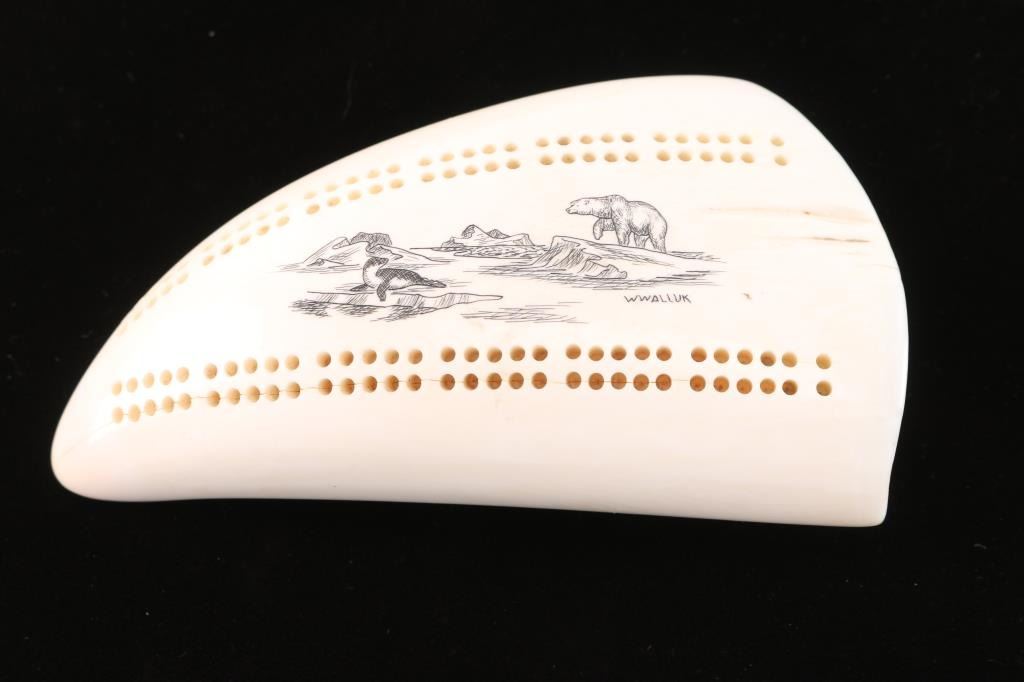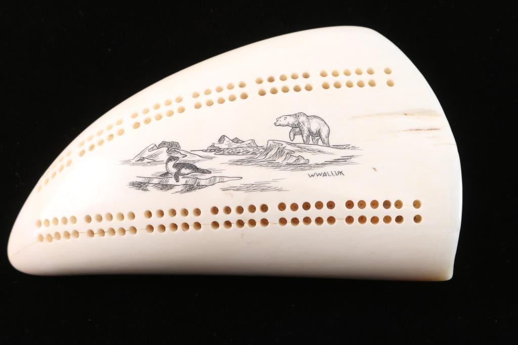 Depicts classic scene of polar bear and seal, signed W. Walluk, native artist. Holes drilled for use as counter in cribbage card game with 2 white and 2 black pegs. Measures 5 3/4" from tip to end. Natural tooth - highly polished.