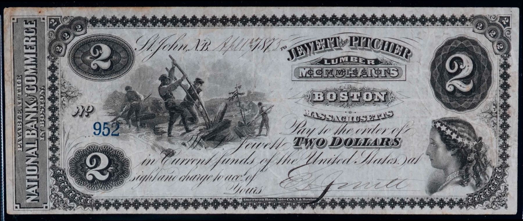 Scrip; Jewett & Pitcher, New Brunswick - Lumber 1875 $2 Partially Engraved date #952 NB-15-12-04-04 VF. "Plain back" uncancelled.