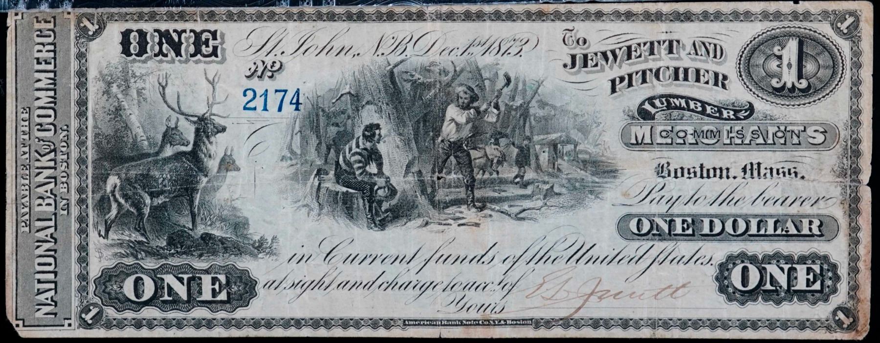Scrip; Jewett & Pitcher, New Brunswick - Lumber merchant 1873 $1 Engraved date #2174 NB-15-12-02-02 VF with small nick. "Green back" uncancelled.