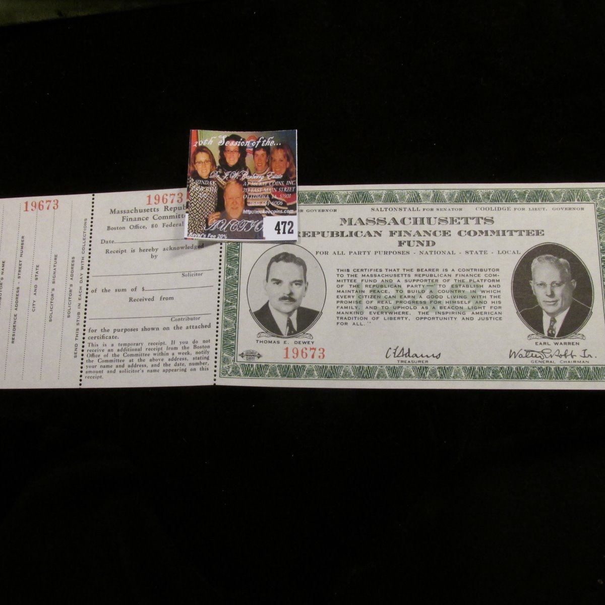 Scrip "Massachusetts Republican Finance Committee Fund For All Party Purposes-National-State-Local", depicts Thomas E. Dewey & Earl Warren, serial number 19673. Near Crisp Unc.