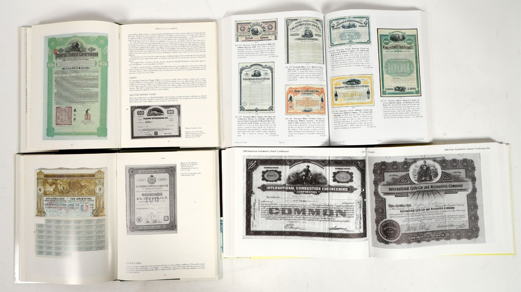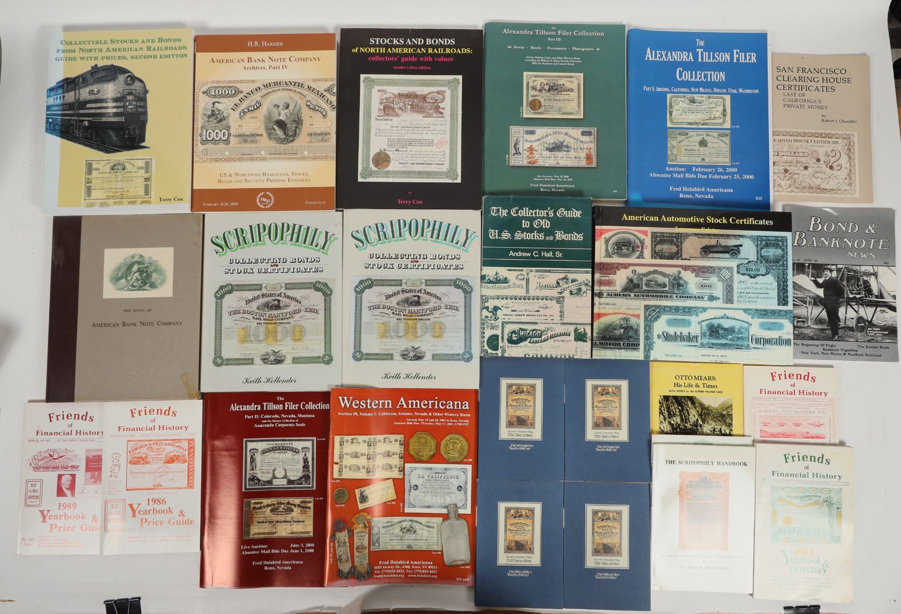 A Group of scripophily references, 50 or more, at least half are various issues of Friends of Financial History c 1980s-90s, among other scripophily periodicals. The remainder are specific scripophily reference works. Nice library; see photo for additional information. Includes railroads, automotive, mining, etc.