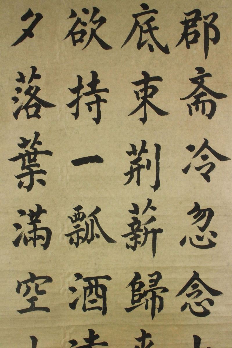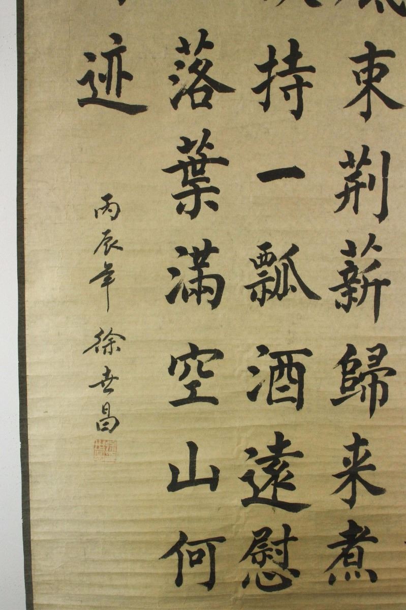 Chinese script calligraphy, hanging scroll, Chinese ink on paper, signed Xu Shi Chang (1855-1939); dated "bing san year" (1916); 129 cm x 64 cm; Xu Shi Chang (1855-1939, was the President of the Republic of China (Beijing government) from October 10, 1918 to June 2, 1922; Provenance: A private collector purchased this calligraphy scroll from Lammert Auction House, Hong Kong, 1957