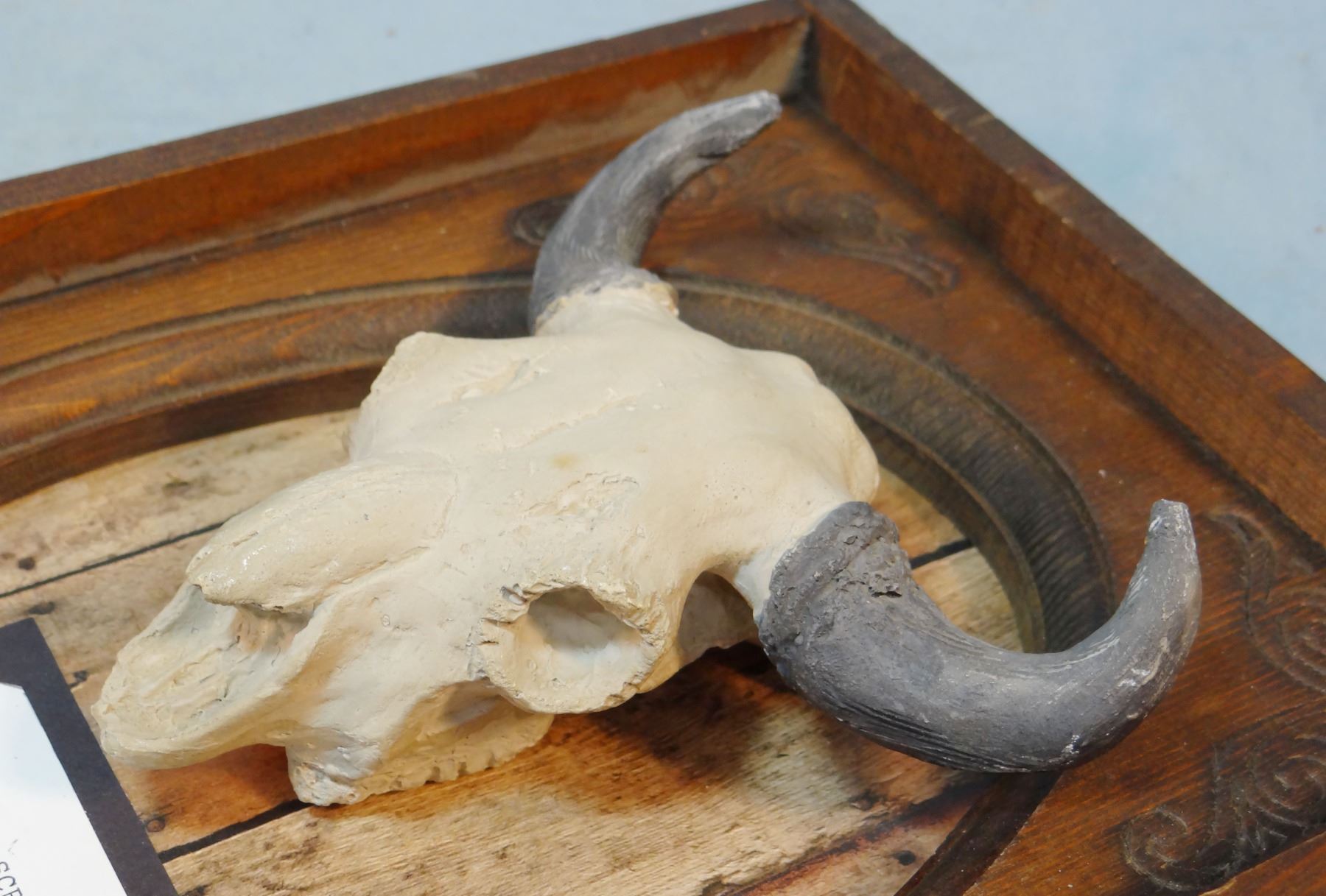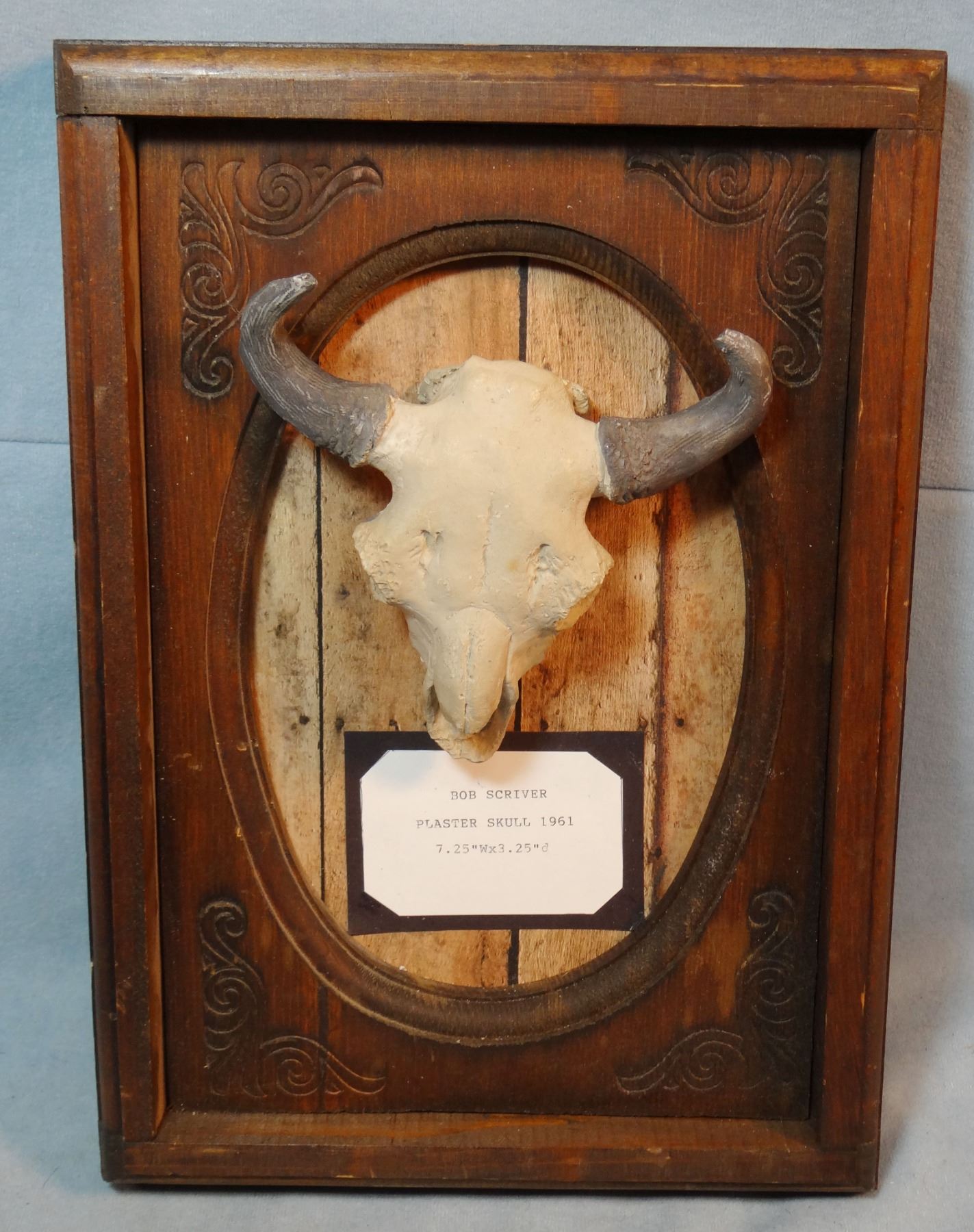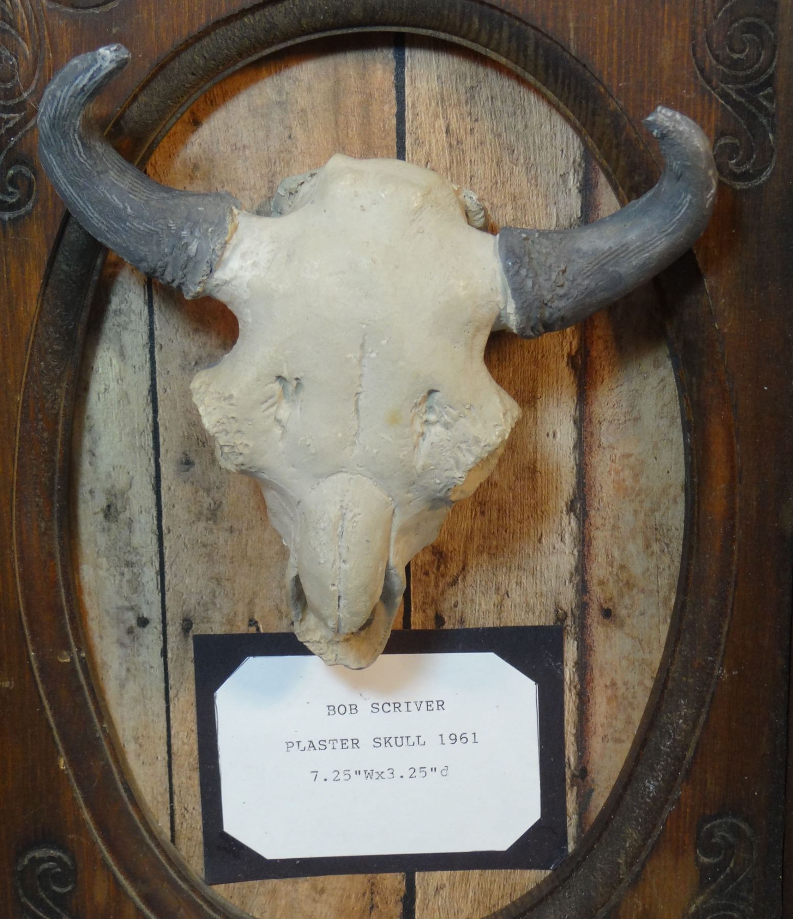 Scriver, Bob, plaster sculture, Buffalo Skull, 7" x 3" in wood frame