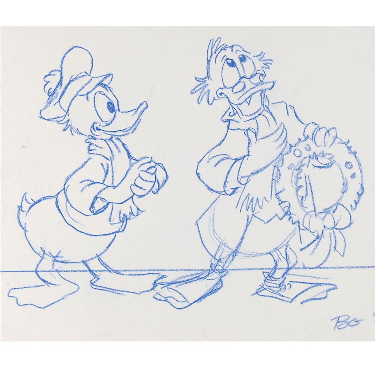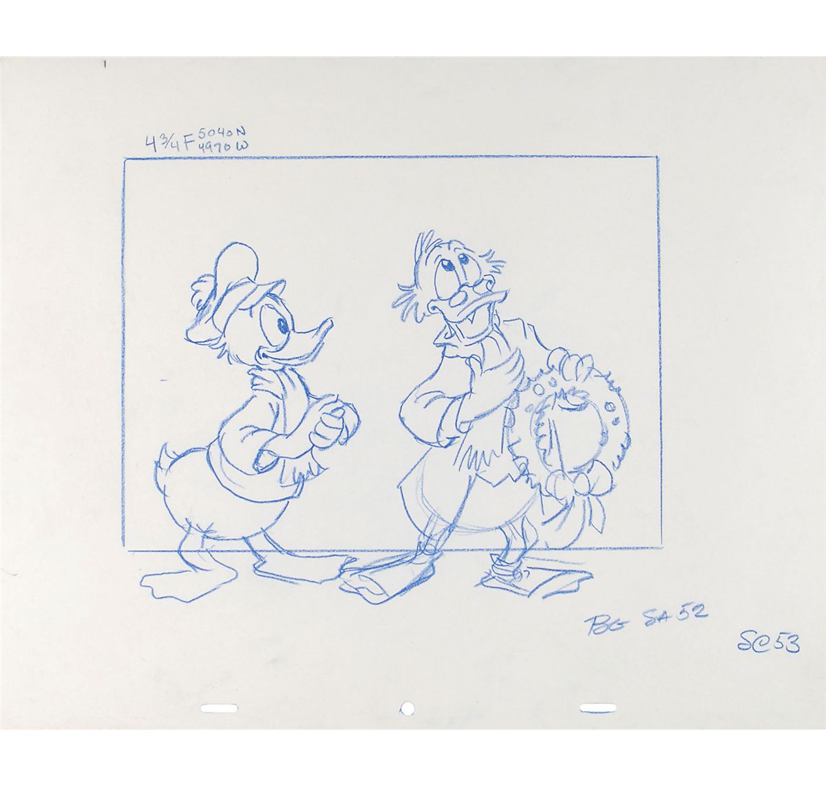 (Walt Disney Studios, 1983) Original layout drawing featuring Scrooge and Donald Duck from Mickey’s Christmas Carol, showing both characters wearing winter scarves with Scrooge holding a wreath. Accomplished in blue pencil on untrimmed 15.5 x 12.5 animation paper. Total image measures 9.5 x 7. In fine condition.