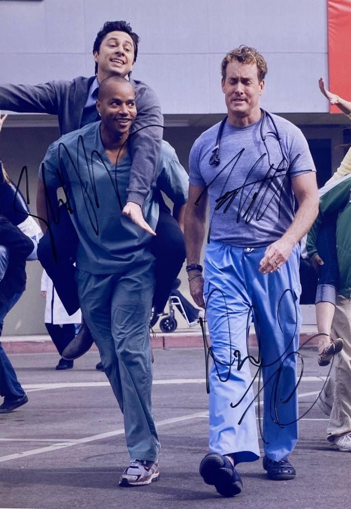Scrubs cast facsimile signed photo autographed by Donald Faison, Zach Braff and John C. McGinley. 8x10 inches. This item is a reprint of an original autograph