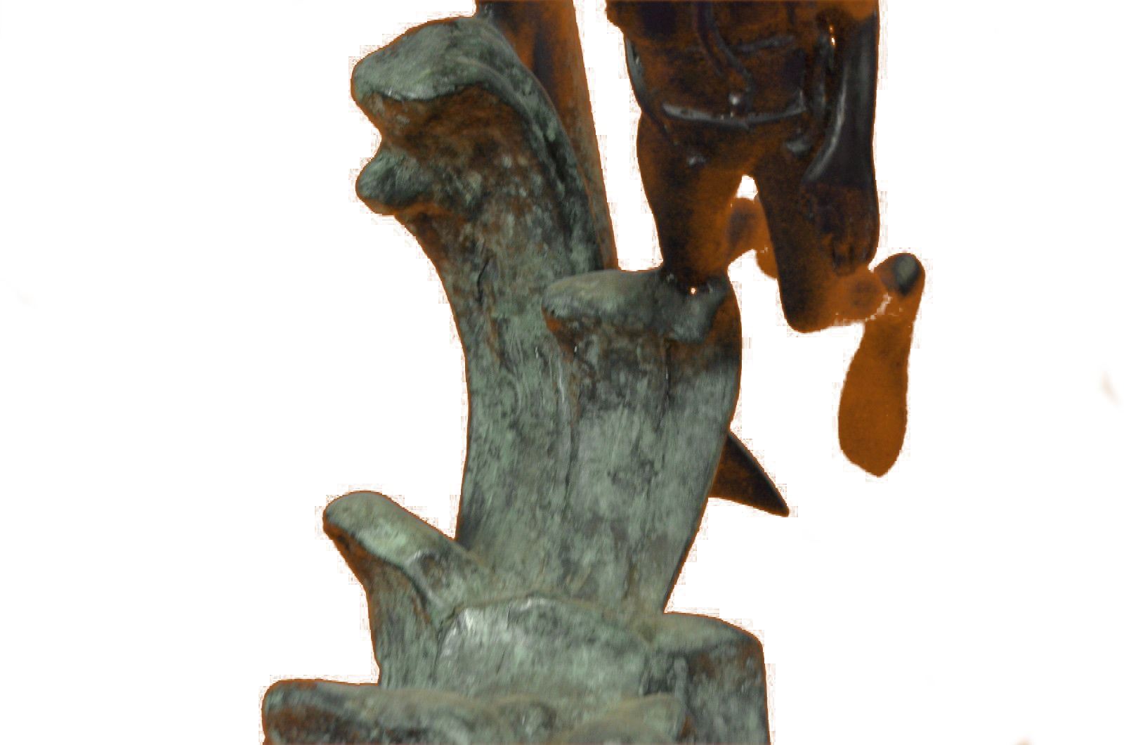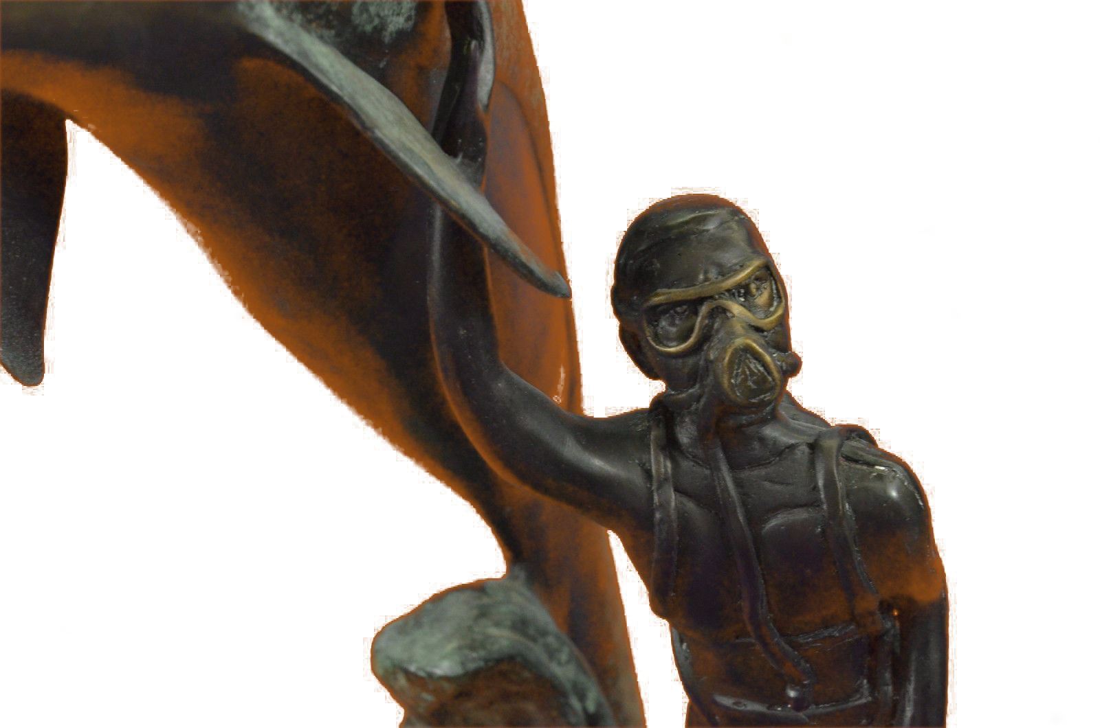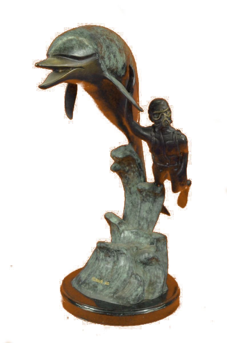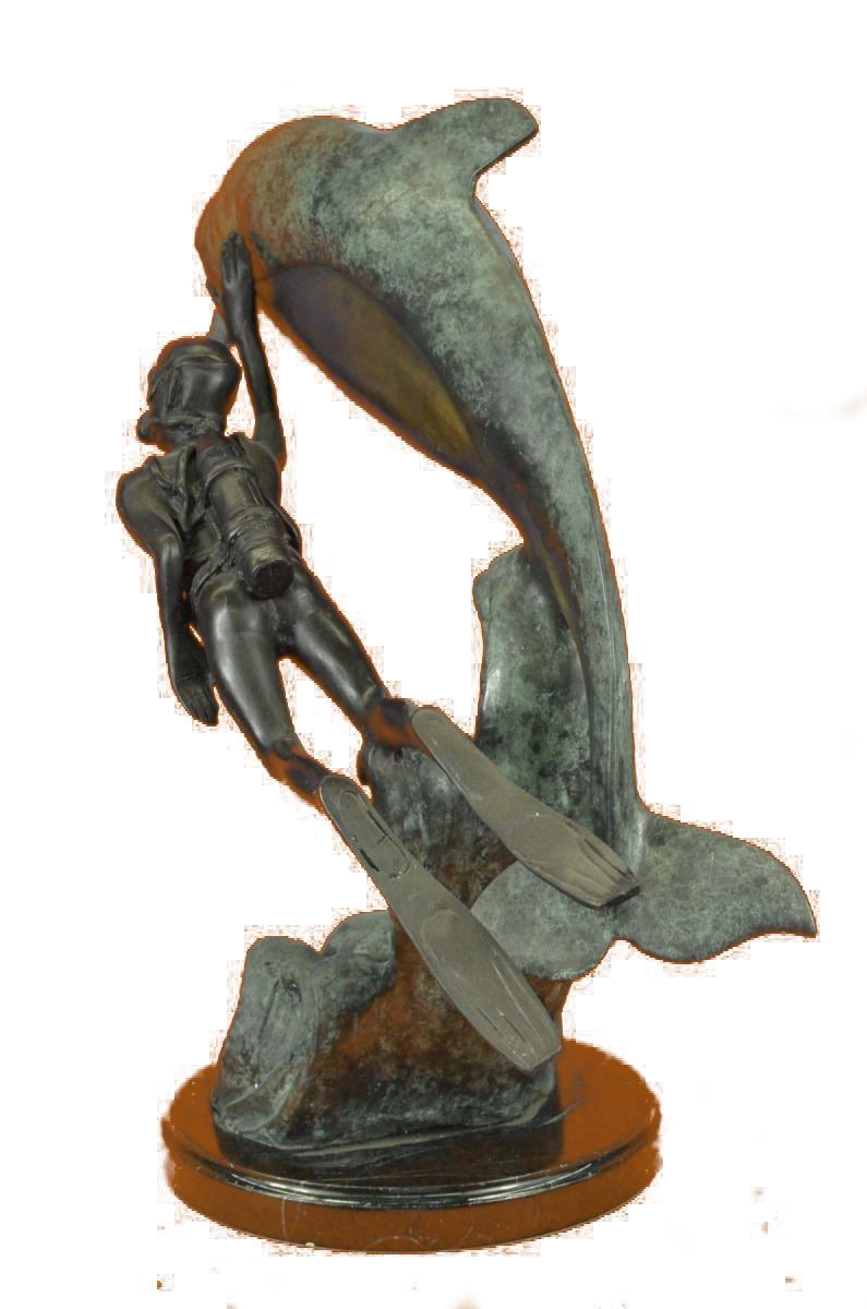 This very unique yet amazing work of art of a scuba diver, and his friend Giant Humpback Whale take a swim in the waters of the ocean while they hold hand to flipper. This Sculpture and has a beautiful green Patina tale, while the Whale looks like the typical happy go jolly mammal. The Whale raises her left arm to insinuate her freedom from underneath the cold and wonderful water world. This sculpture is casted using the ancient old Lost Wax Method stained in brown and green patina. 100% handmade and 100% bronze. Bronze Dimensions with Marble Base: Height 18 X Width 24 inches. Weight: 20 LBS. Inventory: 614700514516