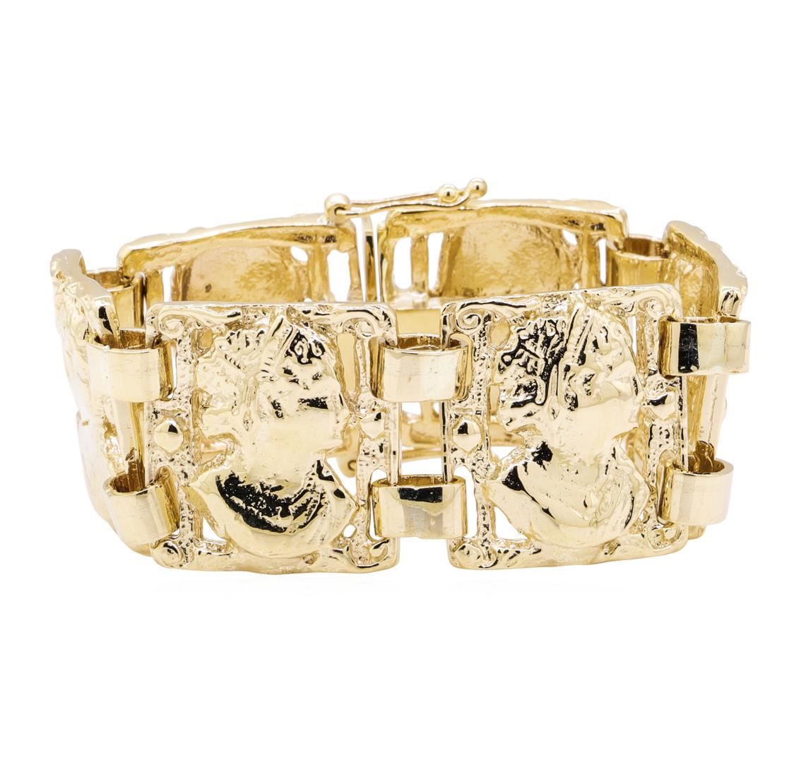 One sculpted station bracelet featuring: 14KT yellow gold weighing 59.5 grams. The bracelet measures approximately five and a half inches in length and 23 millimeters wide. The bracelet features lady's sculpted face motif links.