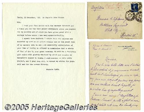 <B>Sculptor Auguste Rodin 1916 Manuscript Letter Signed</B></I> His most famous work, <I>The Thinker</B></I> (Le Penseur) is in front of the Pantheon in Paris. After studying in Paris and Brussels, Rodin produced sculptures which, with their varying surfaces and finishes, resembled the Impressionist painters' effects of light and shade. The great <I>The Gate of Hell</B></I> <I>(La Porte de l'Enfer)</B></I> was commissioned for the Musee des Arts Decoratifs in 1880, and he spent most of the rest of his life working on the 186 figures for these bronze doors. Offered here is a two page manuscript letter in French, dated December 21, 1916, to Captain John Decker and signed in full, "Auguste Rodin." It is in regards to a possible commission for a statue of Joan of Arc and reads (in part): "...I myself love England; I admire her; the welcome she accorded my work as an artist remains one of the great joys of my career..." Fine condition, one fold with slight weakness at edge, 5" x 7" in size, original mailing envelope and English translation included. <I>Accompanied by COA from PSA/DNA.</B></I> 3 Items