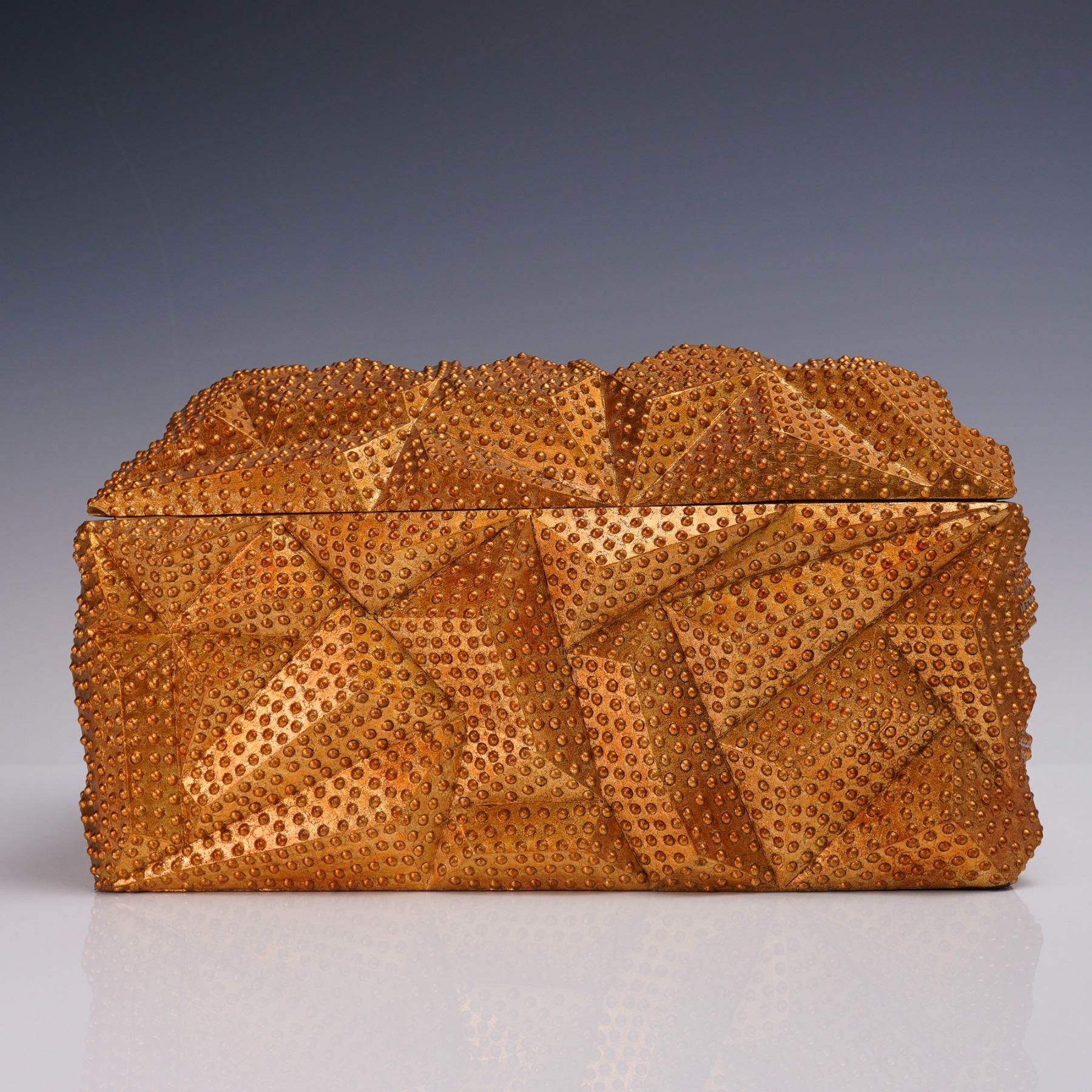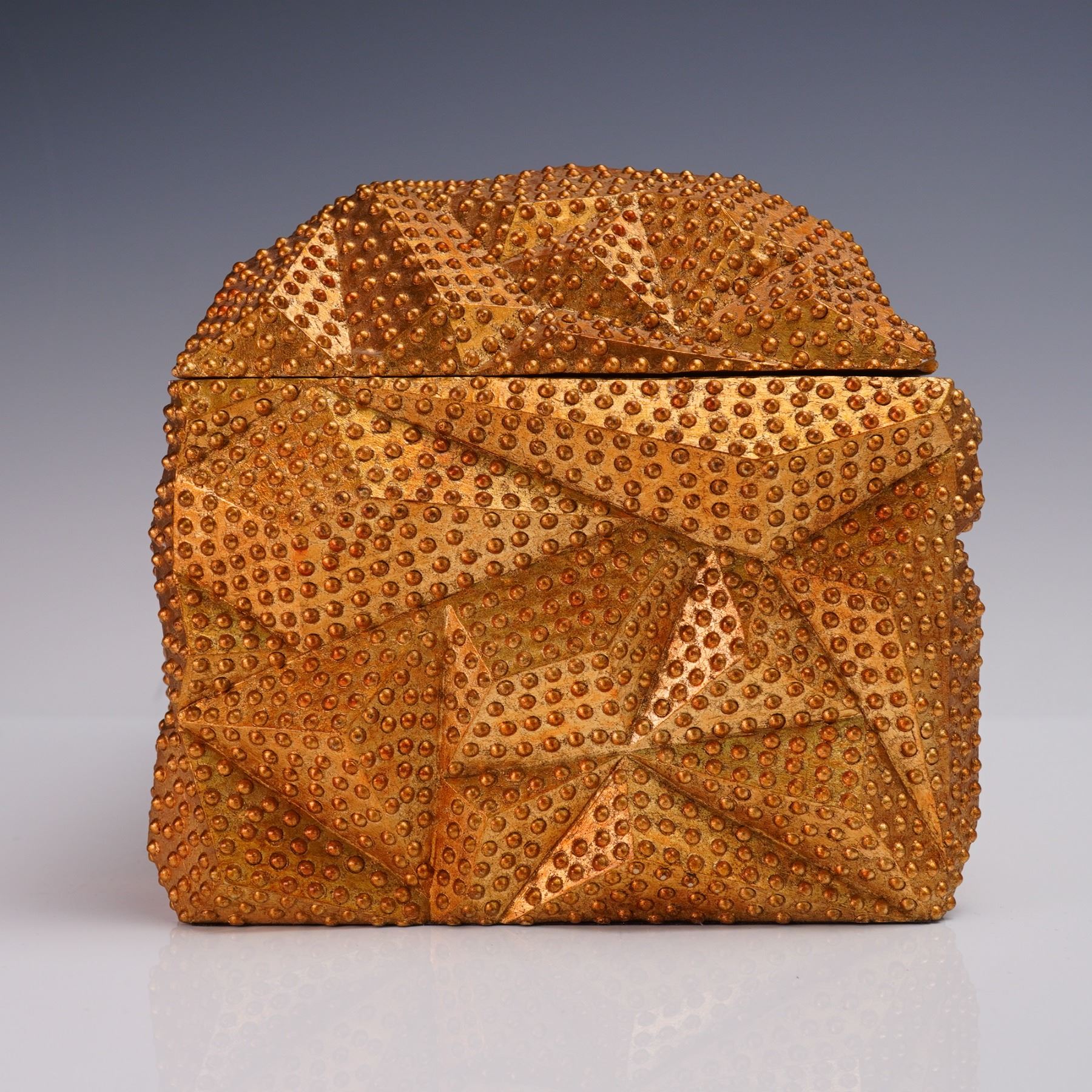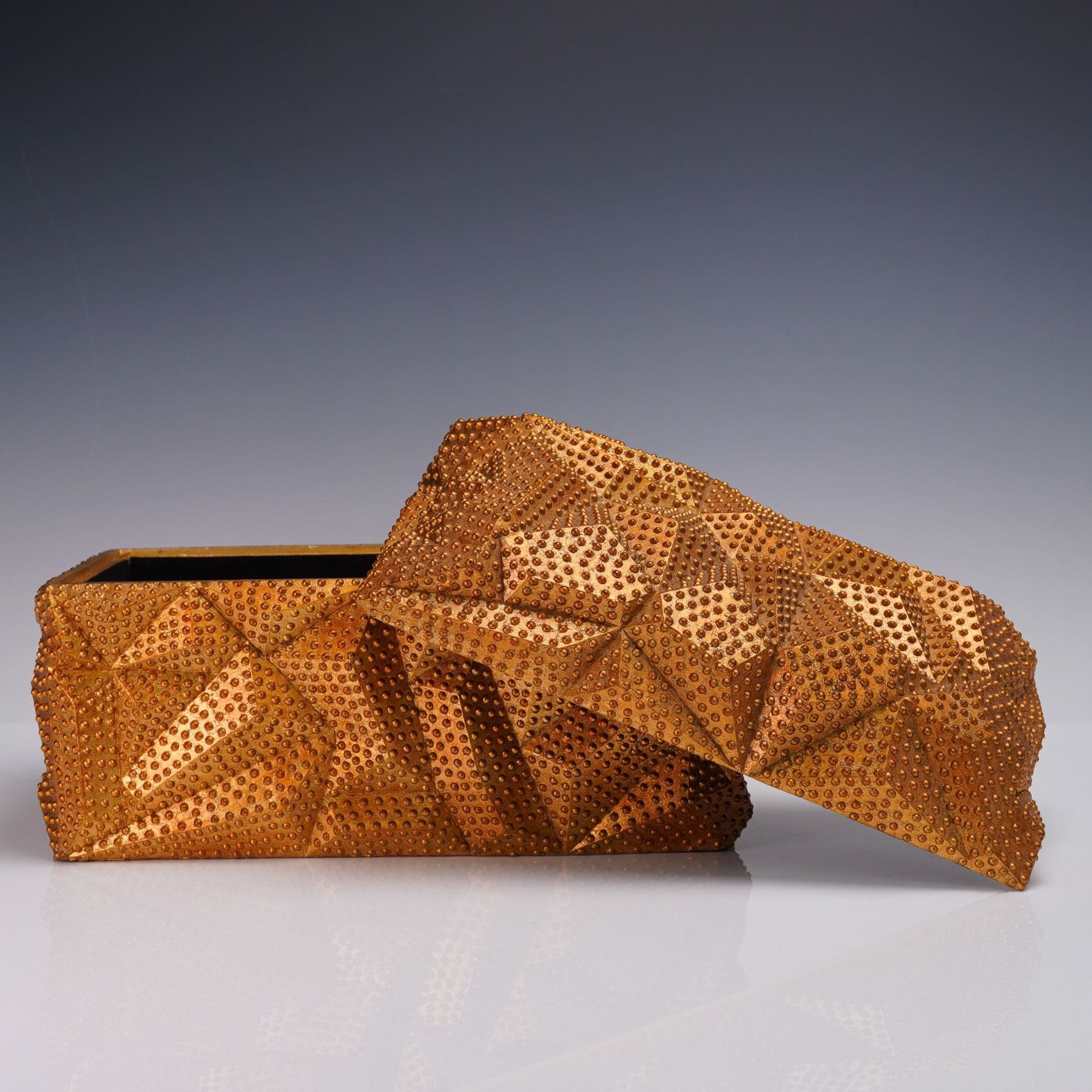 A striking contemporary decorative lidded box with a distinctly sculptural aesthetic. The exterior features a faceted, angular surface adorned with a rhythmic array of raised metallic studs. Each facet is sharply defined, giving the box a crystalline or origami-inspired form, accentuated by the high-shine gold-toned finish. The lid, which fits securely over the top, continues the geometric motif seamlessly, creating a visually dynamic and tactile experience. The surface is studded throughout, adding texture and opulence, while the irregular patterning enhances its avant-garde appearance. This piece rests on a flat, black felted base, preserving surfaces and lending a sense of finish. Affixed to the underside is a product label indicating the item number (DN0931) and production date (05/2012). Additionally, a retail barcode sticker from Z Gallerie remains in place, suggesting it originated from a high-end home decor collection.