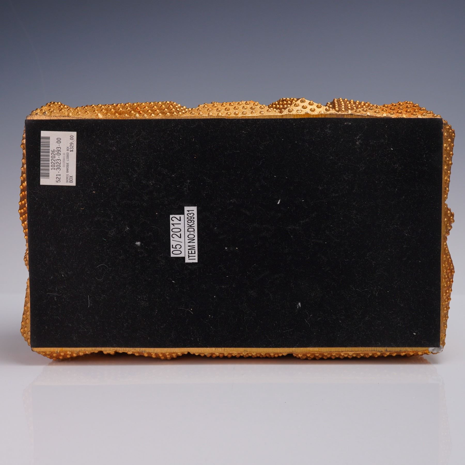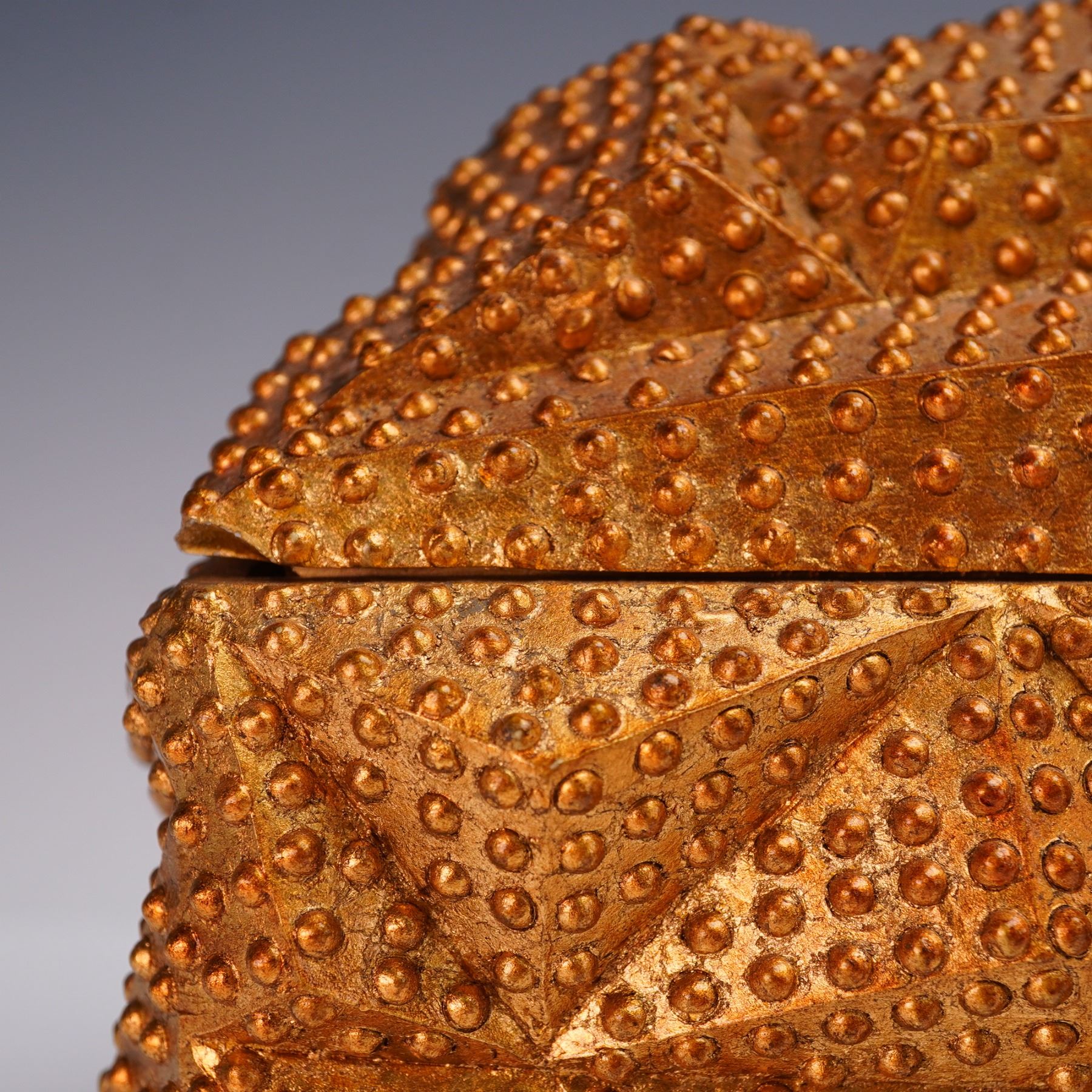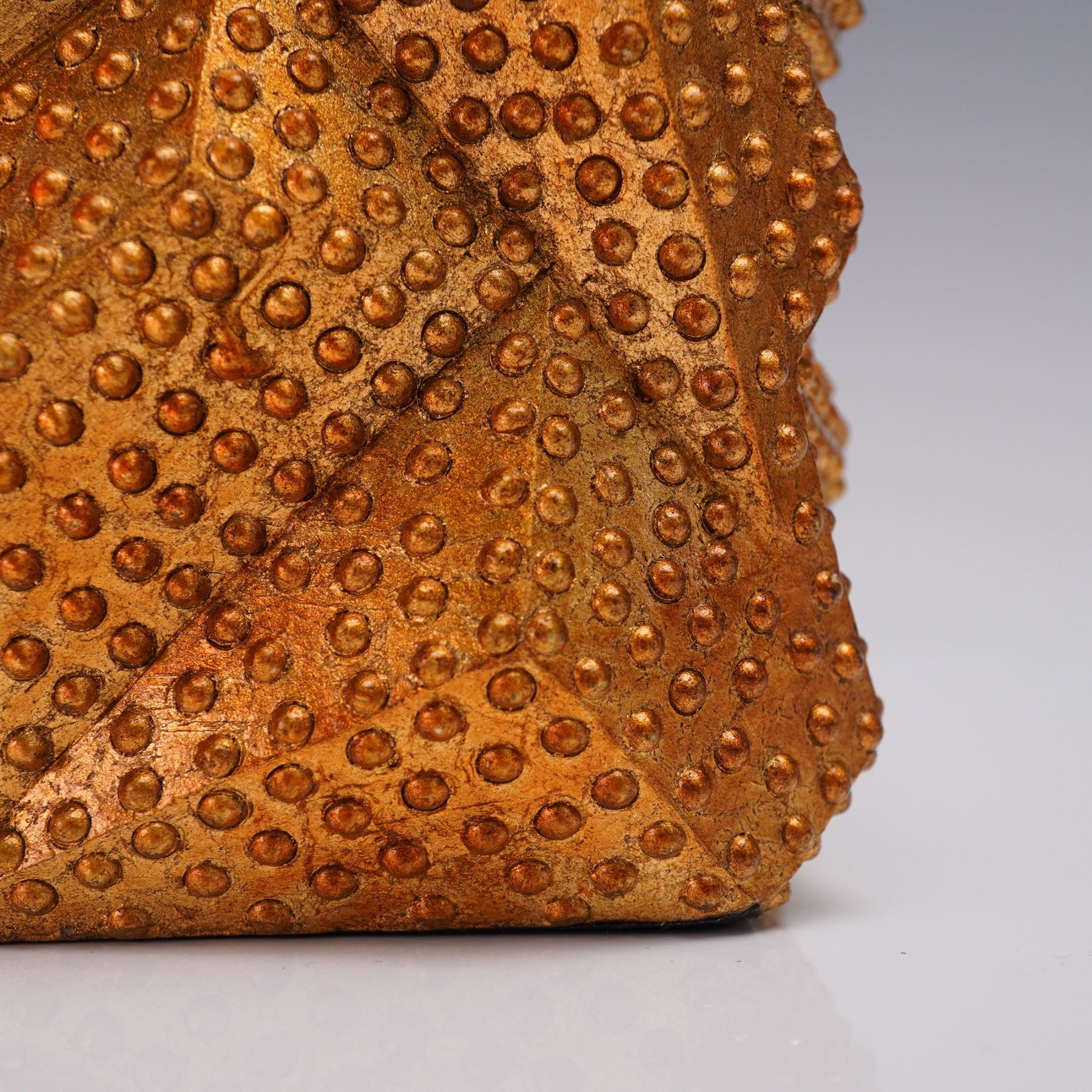 A striking contemporary decorative lidded box with a distinctly sculptural aesthetic. The exterior features a faceted, angular surface adorned with a rhythmic array of raised metallic studs. Each facet is sharply defined, giving the box a crystalline or origami-inspired form, accentuated by the high-shine gold-toned finish. The lid, which fits securely over the top, continues the geometric motif seamlessly, creating a visually dynamic and tactile experience. The surface is studded throughout, adding texture and opulence, while the irregular patterning enhances its avant-garde appearance. This piece rests on a flat, black felted base, preserving surfaces and lending a sense of finish. Affixed to the underside is a product label indicating the item number (DN0931) and production date (05/2012). Additionally, a retail barcode sticker from Z Gallerie remains in place, suggesting it originated from a high-end home decor collection.