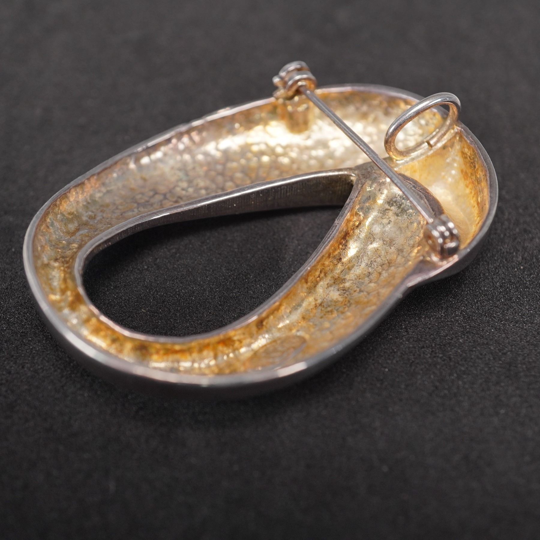 Modernist silver brooch in a bold sculptural loop form, featuring a high-polish finish with fluid, asymmetrical curves. The interior surface displays a hammered texture and bears a stamped maker's mark with a stylized dragon motif and floral symbol. A striking statement piece likely created by a studio artisan jeweler, showcasing mid-century or contemporary design influences. Measures 2"H.