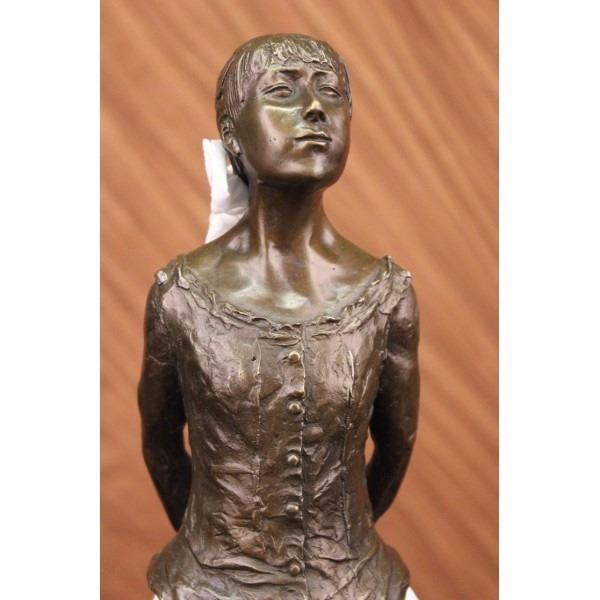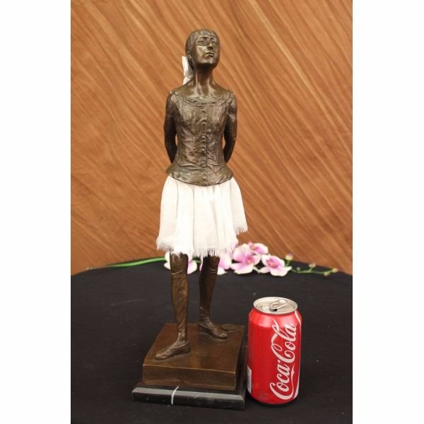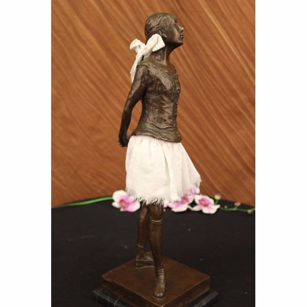 A Unique Piece Of A Young Dancer. A Fluffy White Tutu Is Attached To This Handmade Bronze Sculpture Adding An Extra Dose Of Realism To The Piece. She Holds Her Arms Delicately Behind Her Back As She Gazes Wistfully Into The Air. On The Back Of Her Head Is A Cloth That Matches The Material Of Her Skirt. The French Artist Edgar Degas, Known As A Father Of Impressionism, Is Famous For His Artwork Depicting Ballerinas. This Work Of Art Is Signed Degas. It Stands On A Black Marble Base. The Popular Lost Wax Method Was Used To Craft This Beautiful Sculpture. Bronze dimensions with marble base: Height 18 X Width 6 inches. Weight: 14 lbs.