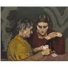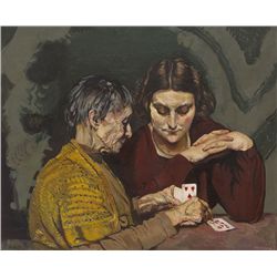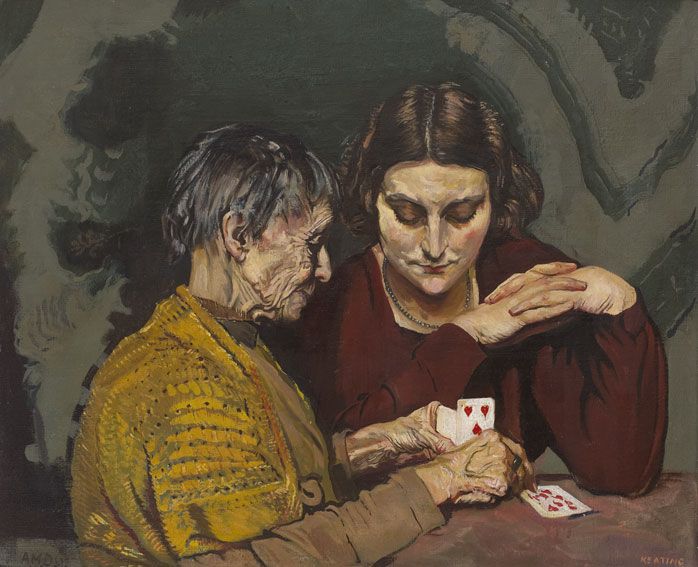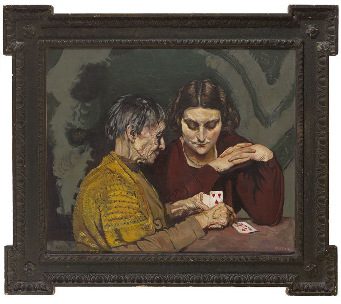 The older woman in Past Definite, Future Perfectis reading the cards. She holds the five of hearts and points to another card from the same suit lying on the table. Her young companion watches attentively, her hands clasped to one side so that she can see everything of the procedure. Both women are focused on the cards, but entirely absorbed in their own thoughts. At first glance, the picture presents a quiet moment between, perhaps, a mother and daughter. The only movement is in the old woman's gnarled hands and in the swirl of light and dark tones in the background. Yet the imagery and the artist's title suggest that this is more than a simple depiction of a fortune-telling session. The painting abounds with symbolism: old age presented as the past, beside youth as representative of the future. The manner in which the old woman concentrates on the suit of hearts suggests that she is thinking about her own past loves. The young woman, perhaps unaware that nothing is perfect, may be hoping for a definite answer about love in the future. The overarching message is that the gaiety and hope of youth leads inexorably towards the wisdom and experience of old age.