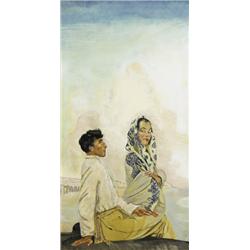 An Aran Man and his Wife is dated 1921 on reverse and is worked in mixed media including chalk, pastel and watercolour. The format of the work is unusual and it may well be a cartoon for a larger oil painting.3 The figures appear to be placed onto a background that loosely depicts the Aran Islands and is also found in such images as The Kelp Burners (Limerick City Gallery of Art).4 However, the figures are not imbued with "the monumentality of the Islanders themselves", rather, they are very small in a huge, nearly pantheistic landscape. The unidentified male figure seems rather uncomfortable in his pose and is much less animated than his female companion.5 Keating uses a similar figure in the right front of foreground of his religious mural Saint Therese in the eponymous church in Mount Merrion in Dublin, completed in 1955.6 By comparison with her male companion, the female in the painting is far more animated and indeed, somewhat flirtatious. She ‘throws’ a look at her admirer that is full of gesture and suggestions, while holding her shawl as armour against his hopeful gaze. Keating often used people he knew as models, and if comparison is made between his Stations of the Cross at Clongowes Wood College, Co. Kildare (1919-1921) or The Scapular Vision at Gort Muire Conference Centre in Ballinteer, Co. Dublin (1949), there can be little doubt that this colleen is a caricature of Keating’s wife, Mai.7