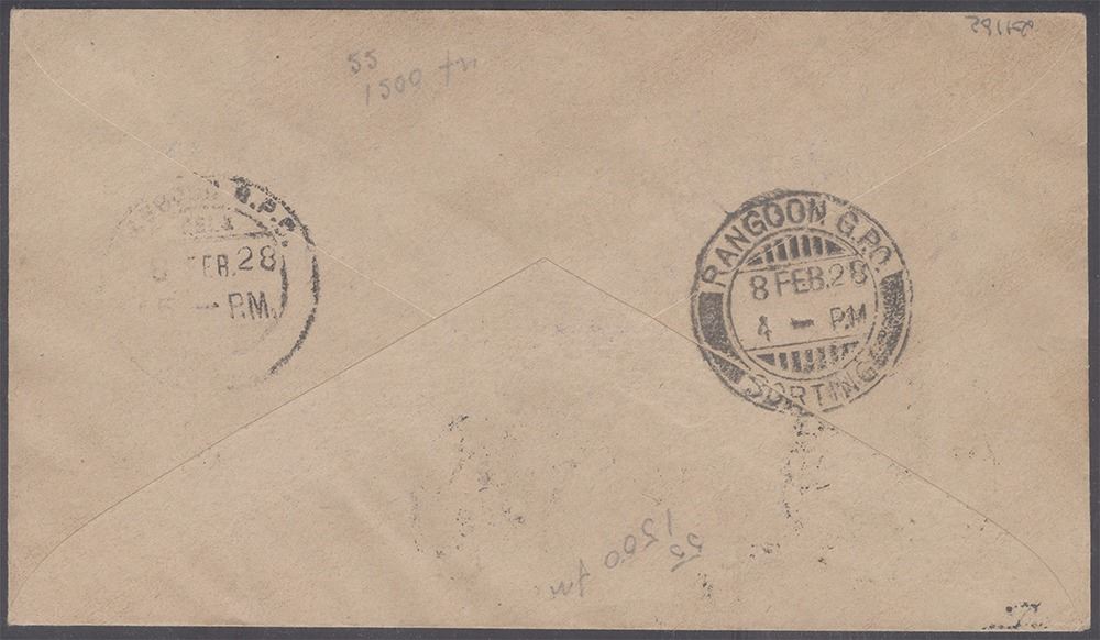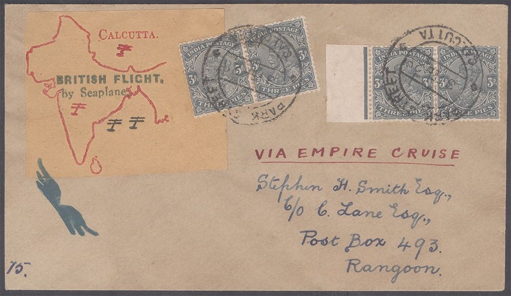 1928,Air Mail (By Sea Plane), KGV, 3pX 2 pairs,with Yellow label of BRITISH FLIGHT,Via Empire Cruise to Rangoon,Cancelled on3 FEB 28,Excellent Condition,Extremely Rare.