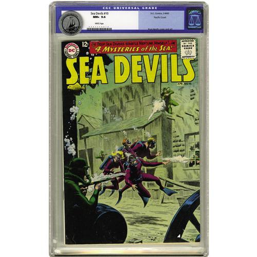 <B>Sea Devils #10 Pacific Coast pedigree (DC, 1963) CGC NM+ 9.6 White pages.</B></I> This grey tone underwater scene by Russ Heath would have to be considered one of the best covers of the title's run. Overstreet 2006 NM- 9.2 value = $170. CGC census 3/06: 1 in 9.6, none higher.