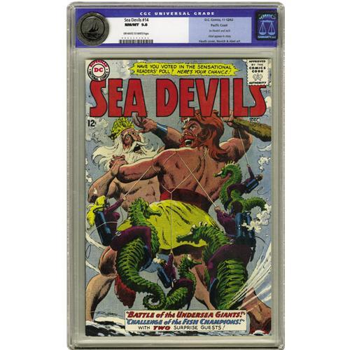 <B>Sea Devils #14 Pacific Coast pedigree (DC, 1963) CGC NM/MT 9.8 Off-white to white pages.</B></I> In addition to providing the interior art for this issue, Irv Novick and Jack Abel appear as characters in the story! The cover is by Russ Heath. Overstreet 2006 NM- 9.2 value = $115. CGC census 3/06: 1 in 9.8, none higher.