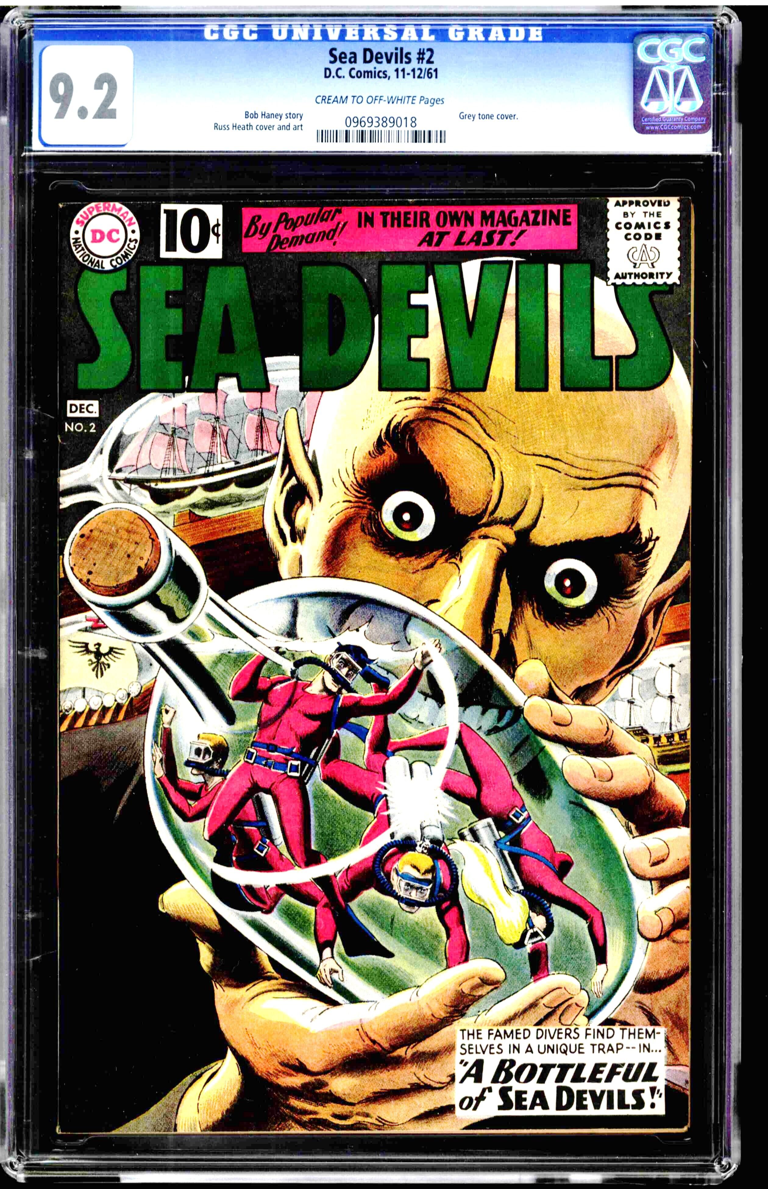 Sea Devils # 2 CGC 9.2 cream to off-white pages. Bob Haney story. Russ Heath cover and art. Grey tone cover. CGC census: 1 at 9.2, none higher.