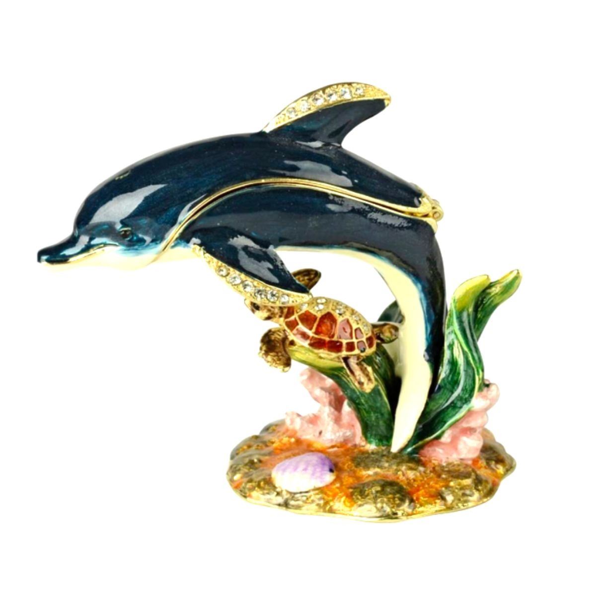 Sea, ocean life, dolphin & turtle trinket, jewel box. Enamel & gilt over pewter, with embedded Austrian crystals. The top of the dolphin lifts up on a hinge to reveal an enameled interior for storing trinkets or jewels. 3 1/4". Comes with gift box.