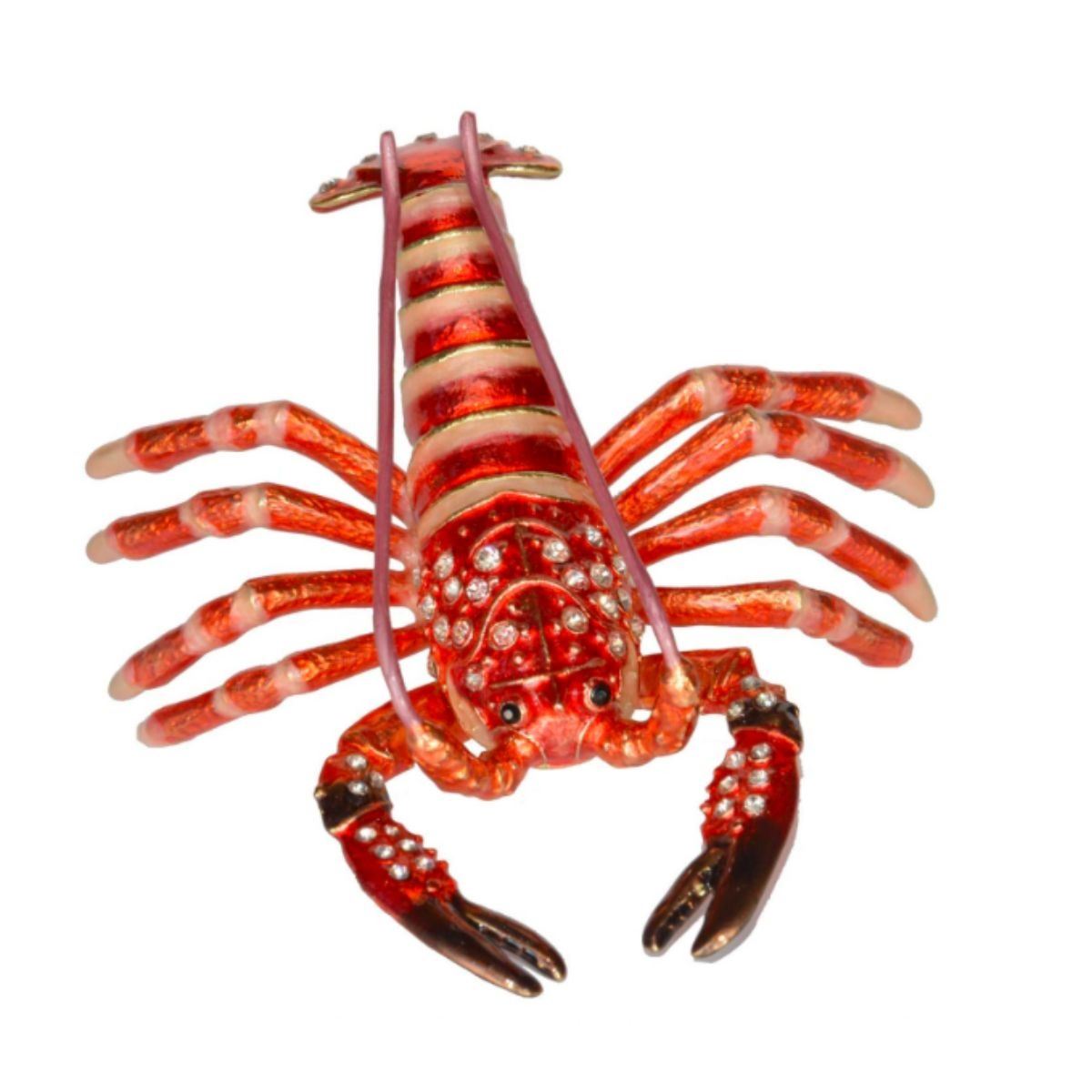 Sea, ocean life, lobster trinket, jewel box. Enamel & gilt over pewter, with embedded Austrian crystals. The top of the lobster lifts up on a hinge to reveal an enameled interior for storing trinkets or jewels. 4 1/8" L X 3 1/2" W X 1 5/8" H. Comes with gift box.Â