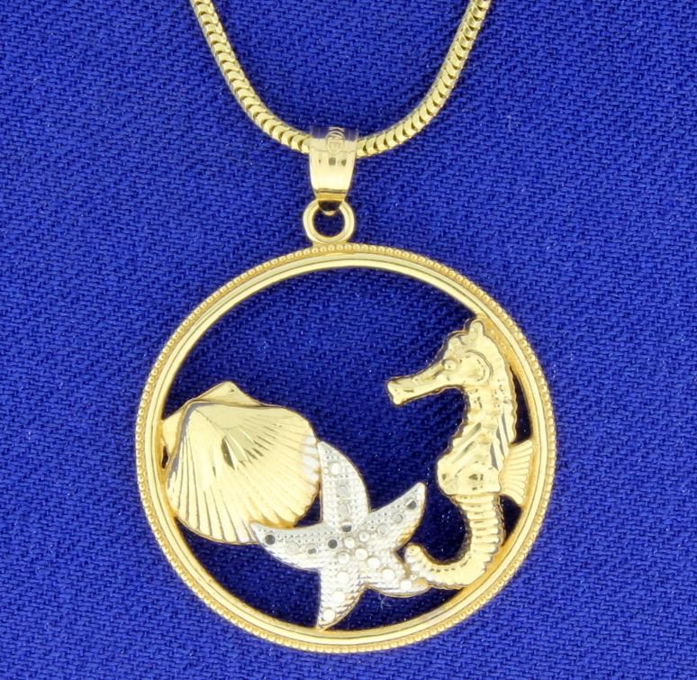 In 14K yellow & white gold, the pendant is 1 1/4 inches long with the bale. And the snake chain is 20 inches long. 6.3g