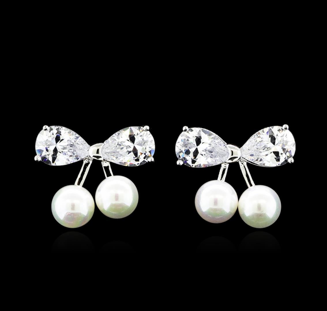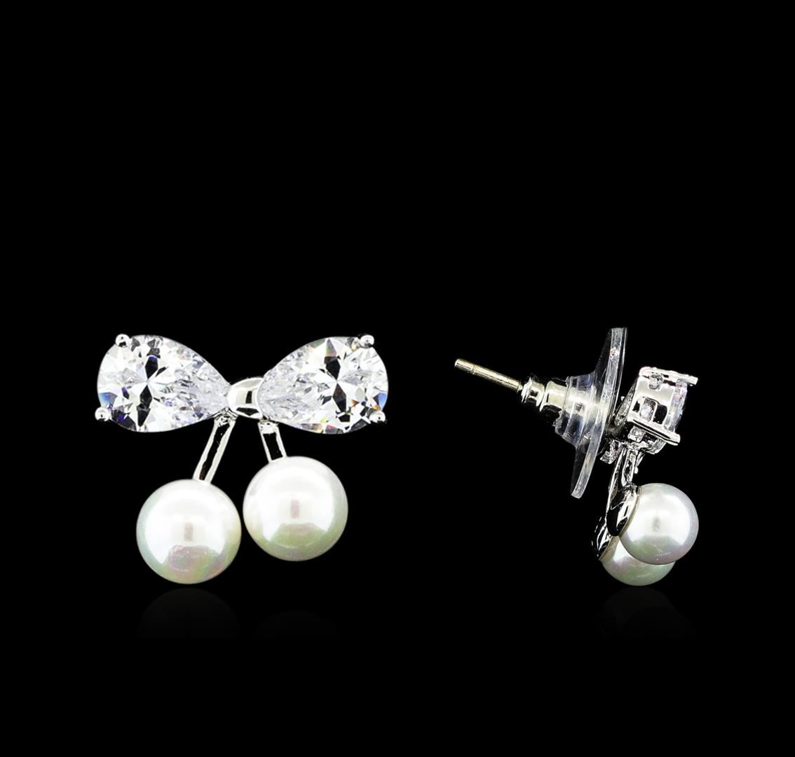 High end designer jewelry. Sea Shell Bow Earrings - Rhodium. Rhodium. White/ Clear. Post.