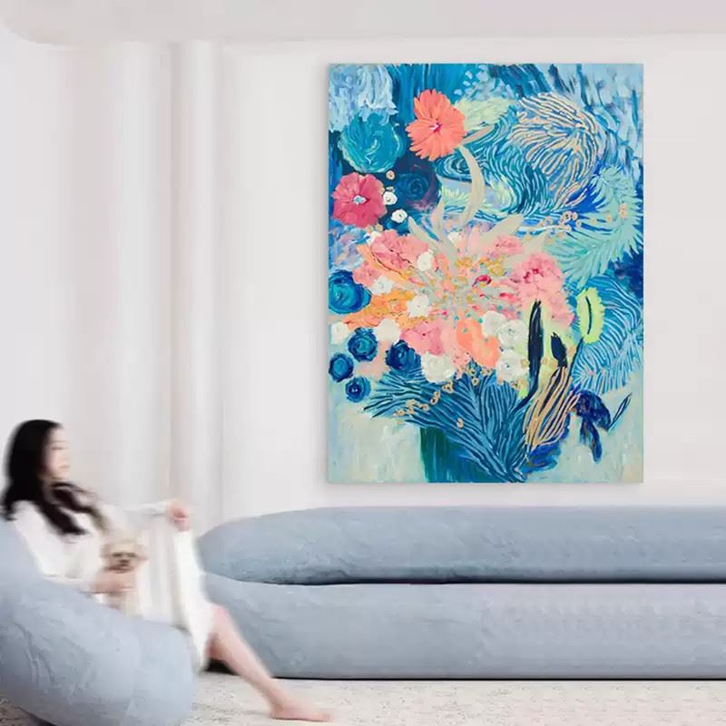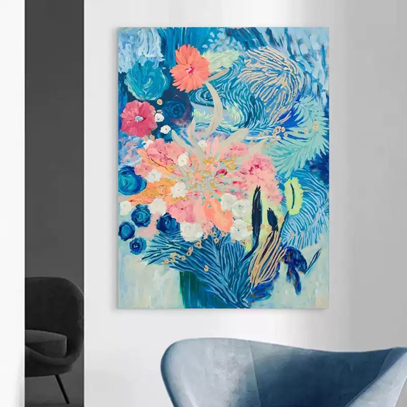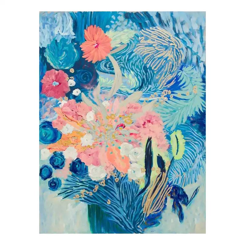 Waves of blue roll like the sea while coral and white blossoms bloom at the center, as if gently lifted by the sound of the tides. Dimensions: 24 x 31 inches.