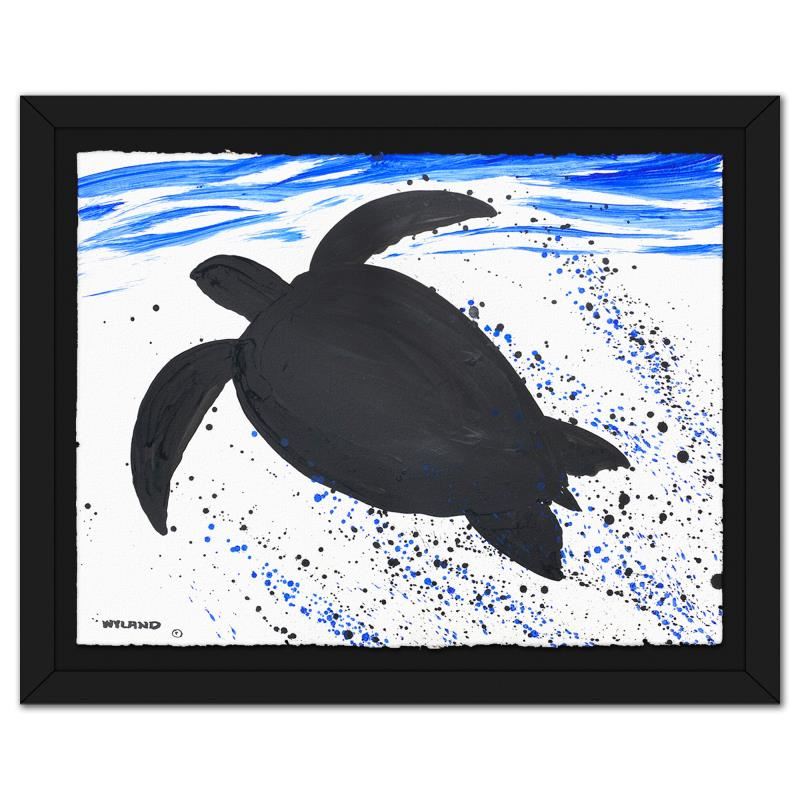 "Sea Turtle Adrift" is an original sumi ink painting on paper by Wyland, hand signed by the artist. This piece comes custom framed. Includes Letter of Authenticity. Measures approx. 33" x 40" (frame), 23" x 30" (image).