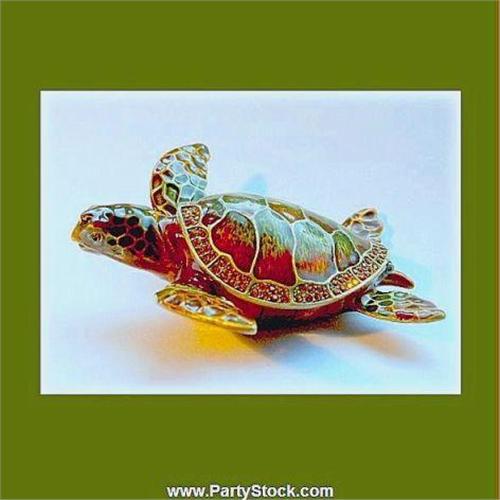 This exquisite Sea Turtle is suspended in "flight". Looks as if it is swimming in the deep blue sea! The shell is framed with dozens of sparkling, genuine, Swarovski Crystals, and it opens to reveal a secret compartment within. Thick enamel and painstaking details make this a truly splendid work of art. Over four inches across. <BR> Sea turtles (Superfamily Chelonioidea) are turtles found in all the world's oceans except the Arctic Ocean. There are seven living species of sea turtles: Flatback, Green, Hawksbill, Kemp's Ridley, Leatherback, Loggerhead and the Olive Ridley. <BR><BR>Each of these items is meticulously crafted from fine pewter. Then, most are embellished or coated in solid 24 Karat Gold. Finally, the piece is hand enameled and lavishly inlaid with genuine Swarovski crystals by skilled artisans. Many of our collectibles are lined in velvet or fitted with ring inserts to make a most splendid jewelry presentation. A ll pieces are finished on the inside with a sparkling, swirled enamel. Our collection adds the definitive touch to any gift-giving occasion.A lso, this collection is issued in limited editions and will become a valuable keepsake to those who possess them, for years to come<BR><BR>Height: 4.25 Inch <BR>Width: 4 Inch