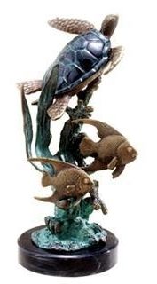 Sea Turtle With Fish Bronze Sculpture - 9.5"H 5.5"W 5.5 "D - Great Attention To Detail - Beautiful Finish - Lost Wax Cast