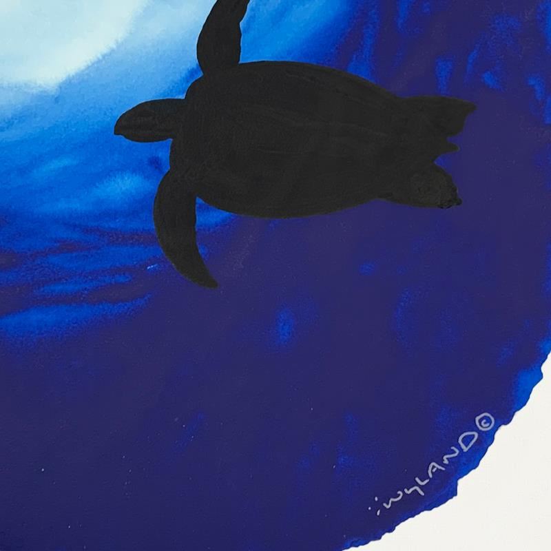 "Sea Turtle in Blue" is an original painting, watercolor on deckle edge paper by Wyland. Hand signed by the artist, the piece comes custom framed and with a letter of authenticity. Measures approximately 30" x 30" (framed), 19.5" x 19.5" (image).