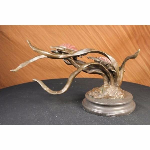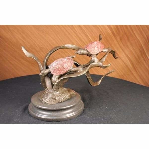 These cute little turtles mates are taking a swim together through the heavily sea water. They play with each other, as they pass a branch of seaweed they lay enjoying their journey. The male leads while the female follows. The beautiful turtle shell is the color of a real tasteful apple, not that you would want to eat a little turtle but the color on these two sea creature are beautiful. This sculpture was cast using the lost wax method and is mounted on a gorgeous heavy marble base with a delightful bronze trim around the base. Bronze dimensions: Height 9 X Width 15 inches. Weight: 12 lbs. Please Note: This is a reproduction bronze sculpture from the original molded and signed. This featured bronze sculpture is a recast after the original, and has been done recently. This 100% bronze sculpture is an abstract piece certain to be a conversation piece.