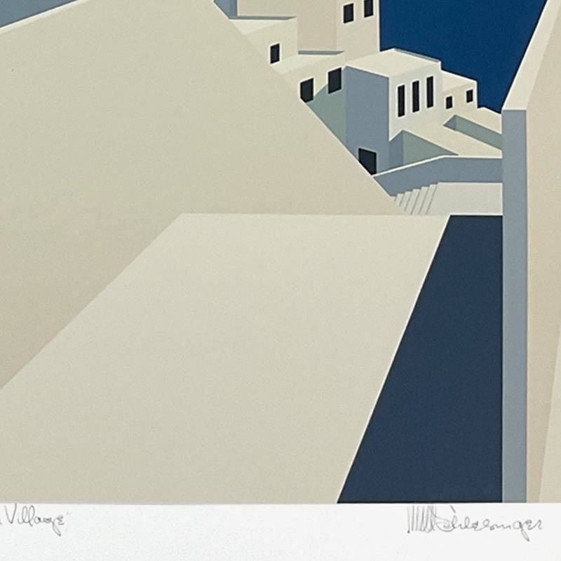 "Sea Village" is a limited edition serigraph on paper by William Schlesinger (1915-2011), numbered 150/225 and hand signed by the artist. Includes Letter of Authenticity. Measures approx. 26" x 32" (border), 20.5" x 25.5" (image). ** Please note: There is a dark horizontal mark on the top-border that may be concealed when the piece is framed. **
