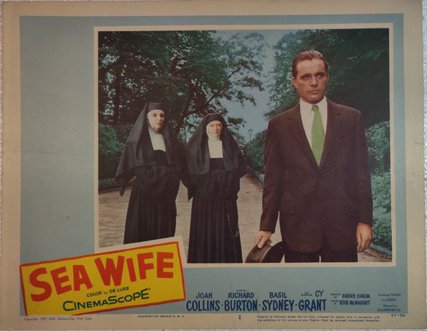 Sea Wife (Alma Productions, 1957) lobby card. Drama, Thriller, Adventure, War. Starring Joan Collins, Richard Burton, Basil Sydney, Cy Grant, Ronald Squire, Harold Goodwin, Roddy Hughes, Gibb McLaughlin, Lloyd Lamble, Ronald Adam, Nicholas Hannen, Otokichi Ikeda, Tenji Takagi, Beatrice Varley. Directed by Bob McNaught. Very minor edge wear, very minor creases, small tear. Very Fine. (11"x14").
