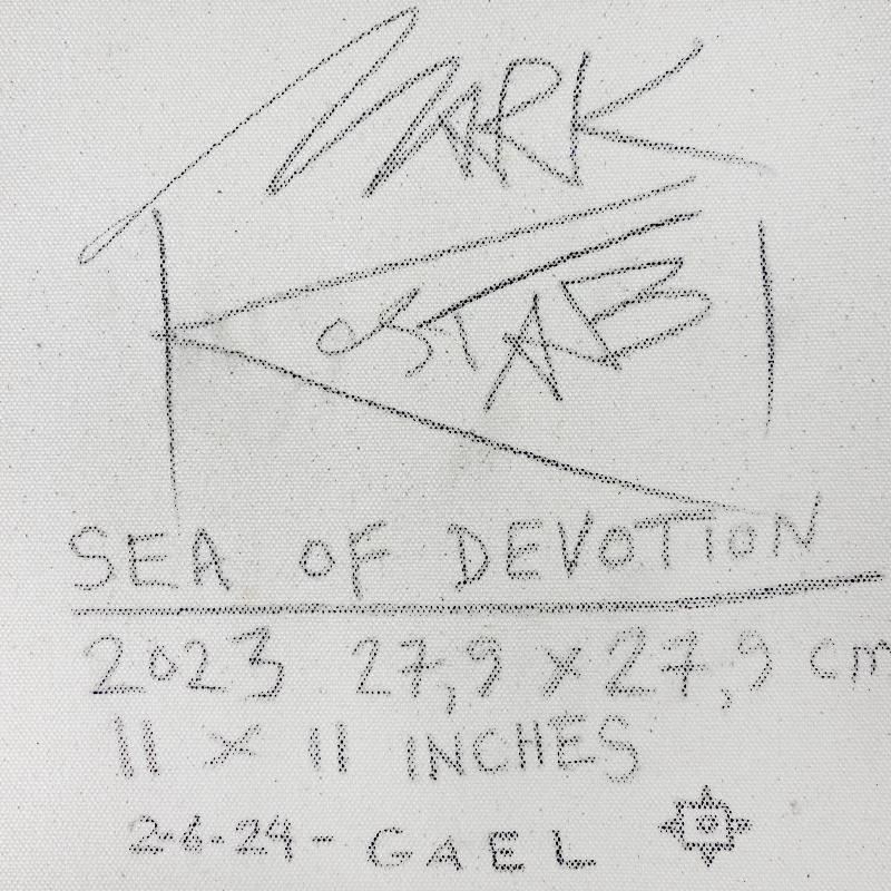 "Sea of Devotion" is an original oil painting on canvas by Mark Kostabi, hand signed by the artist. This piece comes custom framed. Includes Certificate of Authenticity. Measures approx. 21" x 21" (frame), 11" x 11" (image).