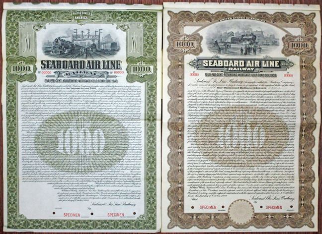 Virginia & North Carolina, 1909. Lot of 2 pieces, Includes: $1000 Specimen 5% Adjustment Mortgage Gold Coupon Bond in olive; and $1000 Specimen 4% Refunding Mortgage Gold Coupon Bond in brown. Both have red specimen overprints, 00000 serial numbers, POCs, and are in Fine-VF condition. ABNC. Brown bond is only listed as a specimen in Cox, Rare. (2)