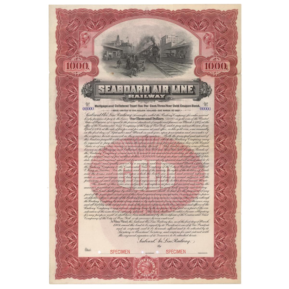 1904, South Eastern U.S. from Virginia to Florida. $1,000 Bond specimen bearing 5% interest. Red/Black. Vignette at top center of a train travelling down the tracks with a city in the background. Folds. Four hole punch cancellations at the officers’ signature lines. Fine.