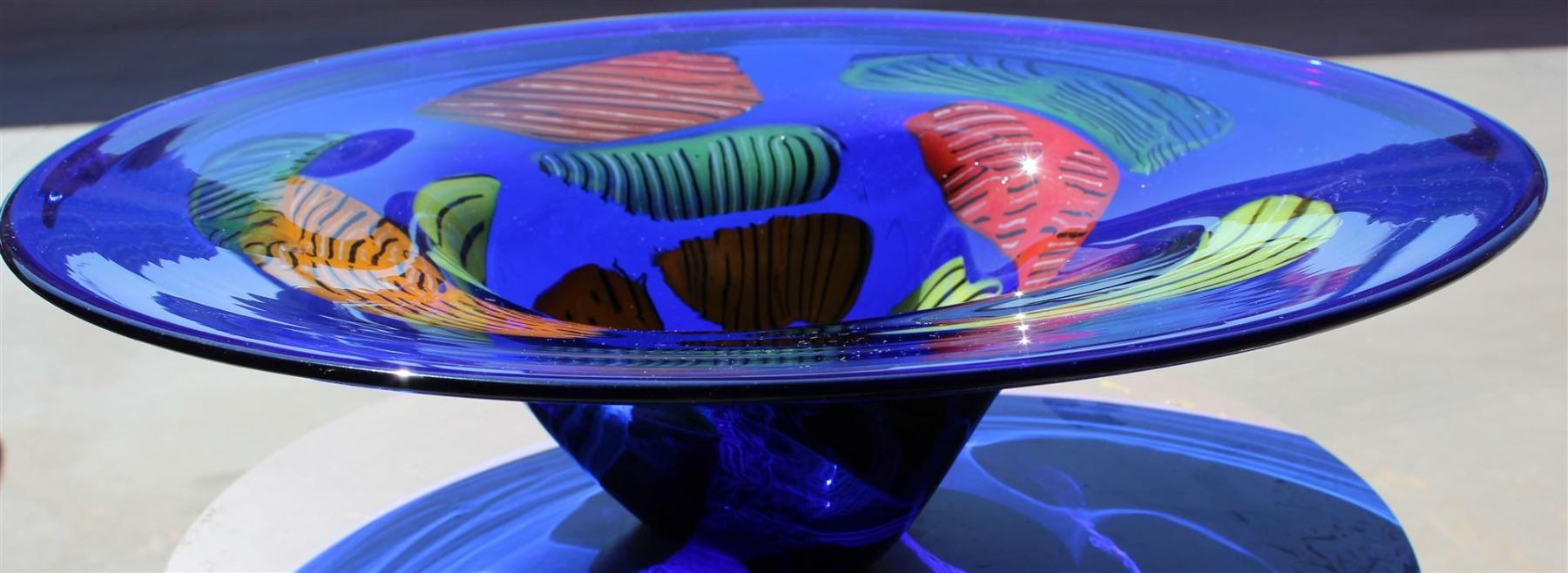 Glass sculptor, Dutch Schulze, produced a round, seafoam blue, glass bowl with varied-colored abstract designs. The bowl #5111 measures 7.5 x 21.25.