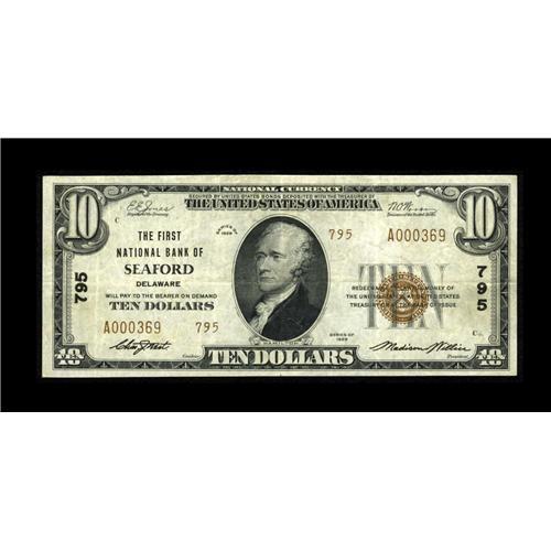 <B>Seaford, DE</B></I> - $10 1929 Ty. 2 <B>The First NB</B></I> Ch. # 795<BR>This <B>Very Fine+</B></I> note retains full original crispness and enjoys considerable claim to the next higher grade.<BR><BR><b>Shipping:</b> Coin/Currency (<a target="_blank" href="http://www.heritageauctions.com/common/shipping.php">view shipping information</a>)
