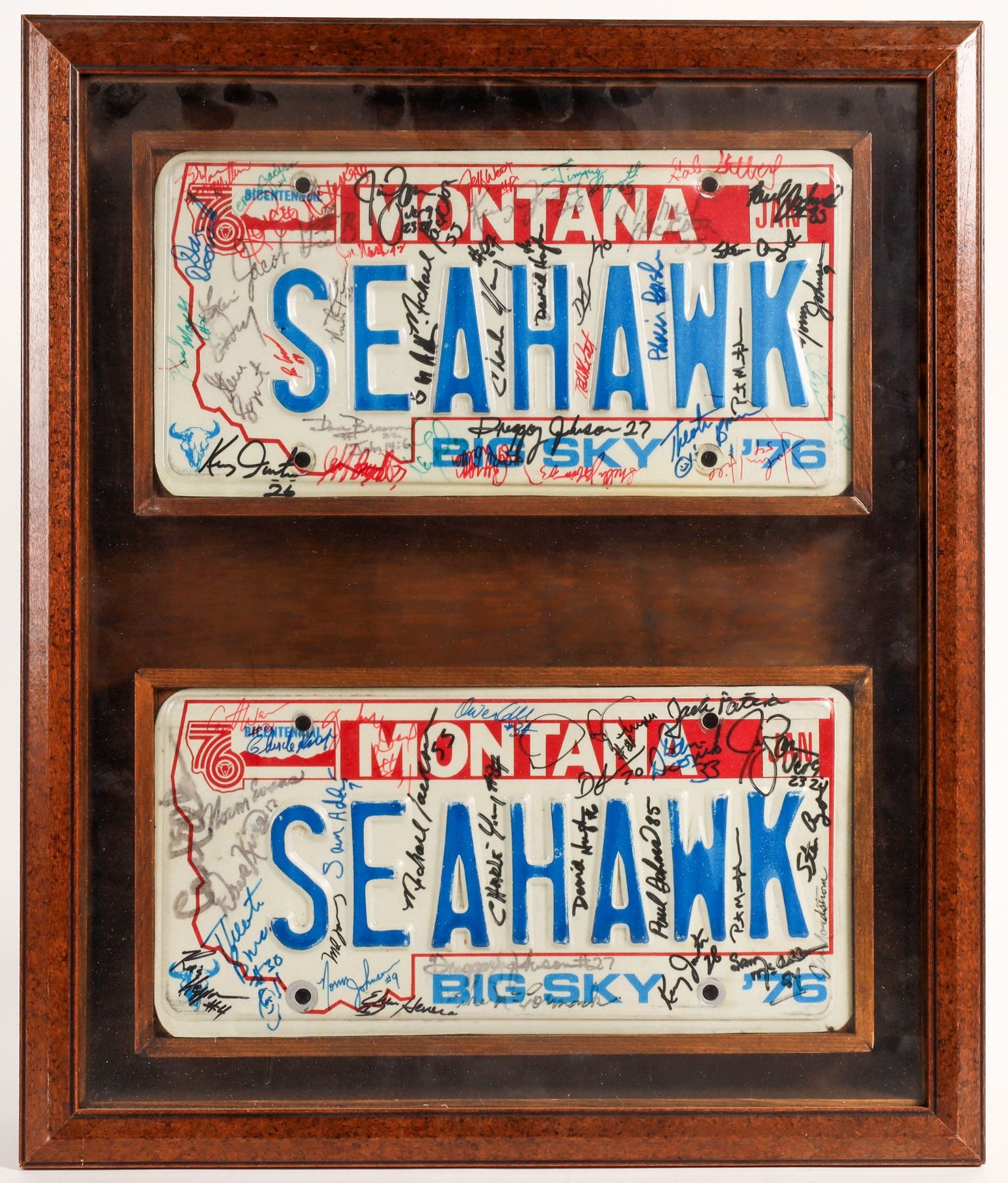 Framed set of two Montana 1976 license plates autographed by the Seattle Seahawks football team. On the reverse is a poem to a Seahawk fan. Frame is 17 x 20 inches. SEE OUR AMERICANA SECTION IF YOU ARE A VINTAGE LICENSE PLATE COLLECTOR! 1976