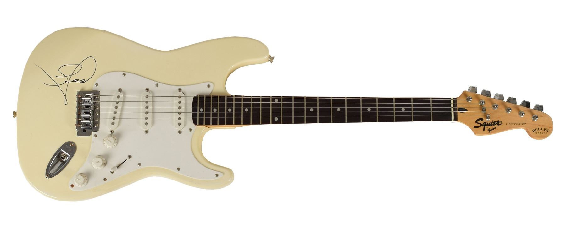 Cream-bodied Fender Squier Bullet Strat electric guitar, signed on the body in black felt tip by Seal. In fine condition, with a few nicks and scuffs. Originally obtained by in-person specialist Mike Wehrmann.