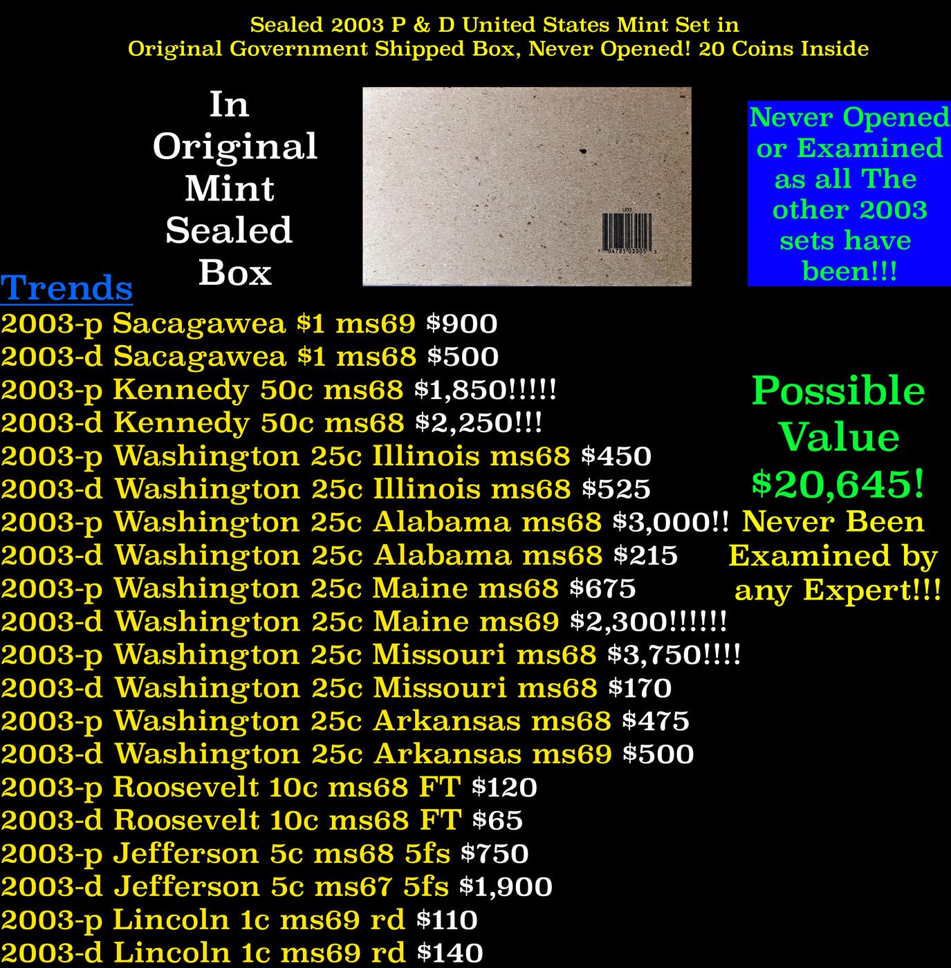 Sealed 2003 United States Mint Set in Original Government Shipped Box, Never Opened! 20 Coins Inside!. Each 2003 set included Philadelphia and Denver Mint examples of each coin issued for circulation, as well as the Sacagawea Dollar, which was not issued for general circulation. Highlighting the sets and comprising half of the coins were the 2003 State Quarters featuring Illinois, Alabama, Maine, Missouri, and Arkansas. Remaining coins were the Lincoln Cent, Jefferson Nickel, Roosevelt Dime, and Kennedy Half Dollar. Packaging for the 2003 Mint Set included outer envelopes depicting a bald eagle against an American flag. Separate red and blue envelopes were created for the Denver and Philadelphia Mint Cons. Within the envelopes coins from each mint were packaged in two separate packs, one containing the State Quarters and the other containing the remaining denominations. A certificate of authenticity signed by the US Mint Director was also placed within one of the envelopes. Get your hands on this never opened 2003 mint set!