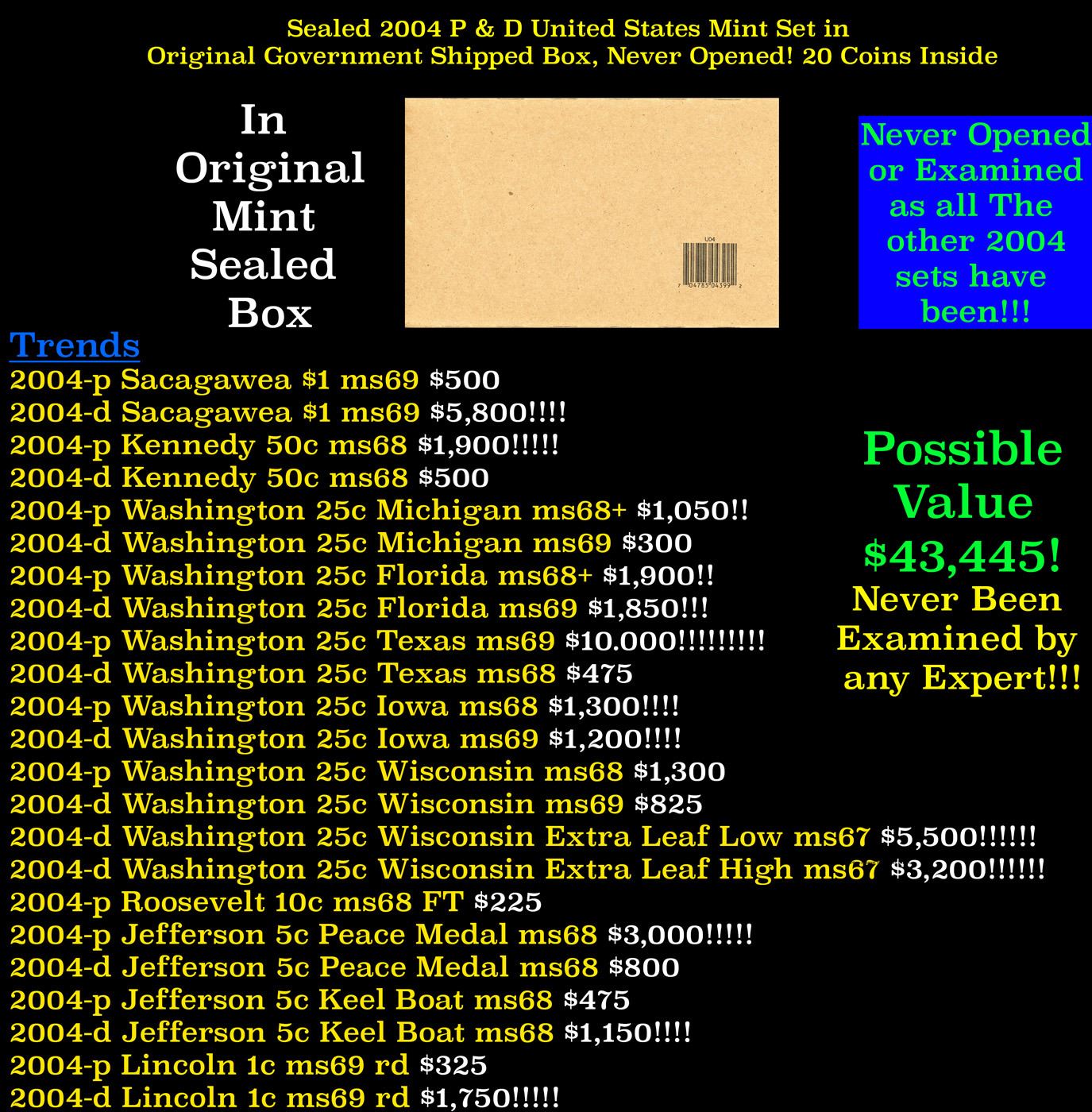 Sealed 2004 United States Mint Set in Original Government Shipped Box, Never Opened! 22 Coins Inside!. The scope of the US Mint’s annual coin set expanded with the 2004 Mint Set. The number of coins per set rose from 20 to 22 pieces. This year two different designs were issued for the five cent piece, as part of the Westward Journey Nickel series to commemorate the Louisiana Purchase and the exploration of the western territories by explorers Meriwether Lewis and William Clark. The obverse of the 2004 nickels remained the same portrait of Jefferson, while the reverse carried a depiction of the keelboat used in the expedition and a peace medal given to local inhabitants in the territories. Still in progress was also the design series for the 50 State Quarters Program, which had begun in 1999. For this year, the reverse designs of the quarters featured Michigan, Florida, Texas, Iowa, and Wisconsin. These coins honored the twenty sixth to thirtieth states to join the union. Remaining coins within the annual uncirculated coin set were the Lincoln Cent, Roosevelt Dime, Kennedy Half Dollar, and Sacagawea Dollar. At this point in time, the two largest denominations were not issued for circulation, but only included in collector and numismatic products. Packaging for the set highlighted the new nickel designs, putting large sized images of the coins at the center of each envelope. The other coins were depicted in smaller scale to the side of the envelope. Get your hands on this never opened 2004 mint set!