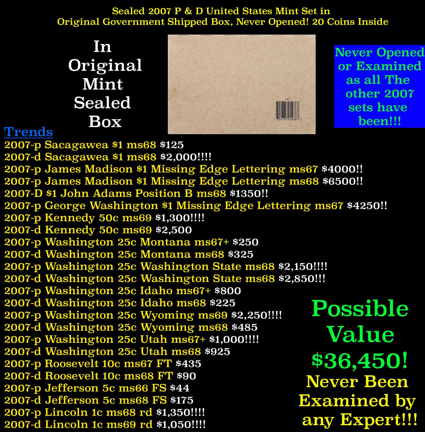 Sealed 2007 United States Mint Set in Original Government Shipped Box, Never Opened! 20 Coins Inside!. Starting with the 2007 Mint Set significantly altered the packaging to coincide with the launch of the Presidential Dollars series, which had the impact of boosting the number of coins per set to 28, compared to 20 coins in the previous year. The sets were the first to include the uncirculated versions of the first four releases of the Presidential $1 Coin Program was highlighted. The Presidents depicted were George Washington, John Adams, Thomas Jefferson, and James Madison. Their portraits appeared on the obverse of each coin with a common portrayal of the Statue of Liberty on the reverse. The coin series featured incused edge lettering, which contained the date, mint mark, and the mottoes “E Pluribus Unum” and “In God We Trust”. The 2007 Mint Sets also included the next five designs released for the State Quarters Program, featuring Montana, Washington, Idaho, Wyoming, and Utah. The remaining coins were the Lincoln Cent, Jefferson Nickel, Roosevelt Dime, Kennedy Half Dollar, and Sacagawea Dollar. All coins continued to utilize the satin finish, which had been introduced for the annual set in 2005. Around this time, the US Mint began to refer to the satin finish versions as “uncirculated versions”. The sets were now packaged in two separate blister pack folders. The outer flap included illustrations of the Denver and Philadelphia skylines. Folders opened to reveal 14 coins from each mint, sealed in individual blisters which allowed both sides of the coins, as well as the edges to be seen. The back side of the flap included coin specification information and a certification of authenticity. Get your hands on this never opened 2007 mint set!