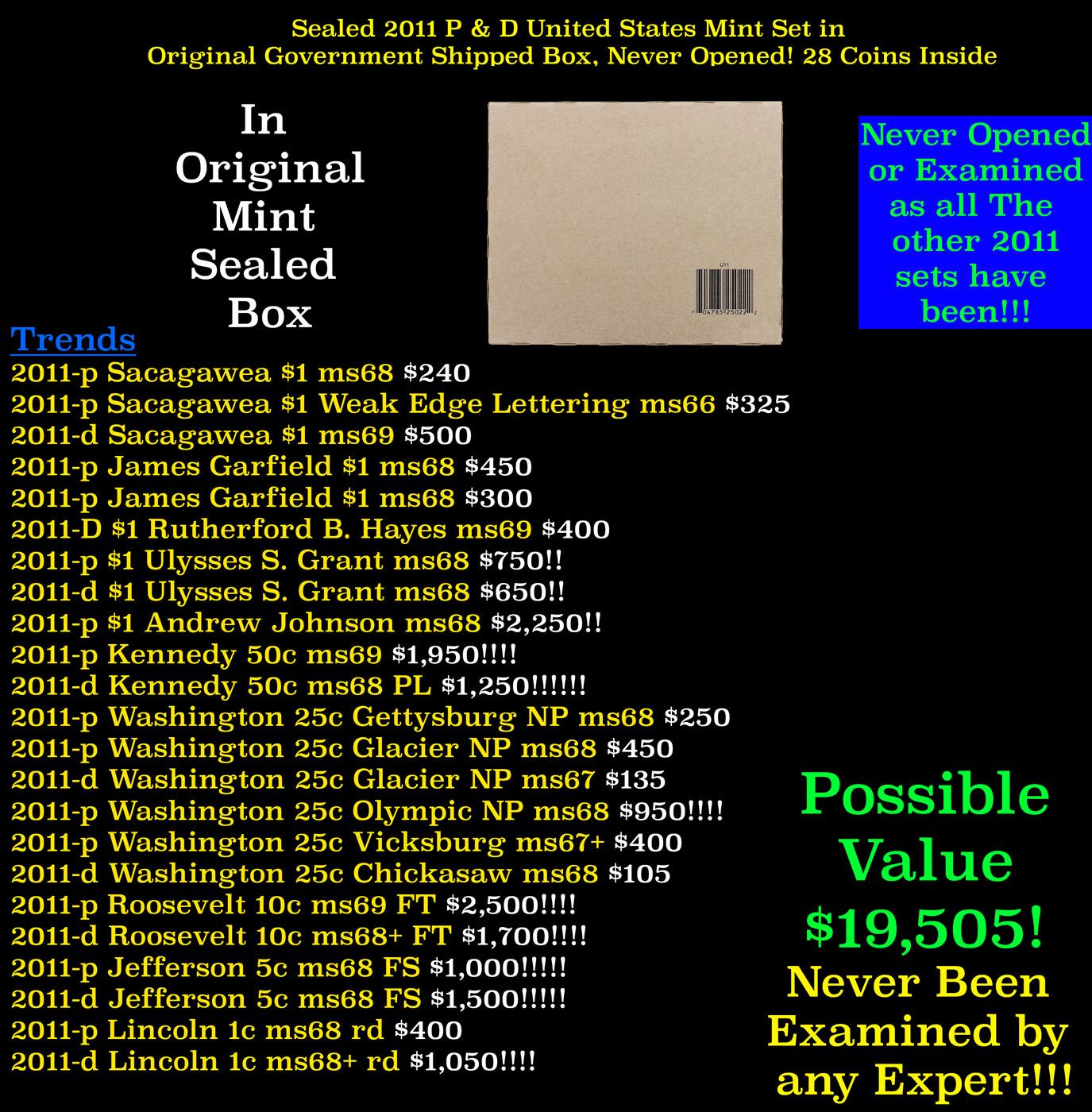 Sealed 2011 United States Mint Set in Original Government Shipped Box, Never Opened! 28 Coins Inside!. The 2011 United States Mint Uncirculated Coin Set includes two folders of 14 coins each, with coins from the United States States Mint at Denver and the other with coins from the United States Mint at Philadelphia, for a total of 28 coins.Each folder includes:* (5) America the Beautiful Quarters (honoring Gettysburg National Park in Pennsylvania, Glacier National Park in Montana, Olympic National Park in Washington, Vicksburg National Military Park in Mississippi and Chickasaw National Recreation Area in Oklahoma)* (4) Presidential $1 Coins (honoring Andrew Johnson, Ulysses S. Grant, Rutherford B. Hayes and James Garfield)* (1) Native American $1 Coin with a reverse design emblematic of the peace alliance created by the 1621 Wampanoag Treaty* (1) Kennedy half-dollar* (1) Roosevelt dime* (1) Jefferson nickel* (1) Lincoln cent