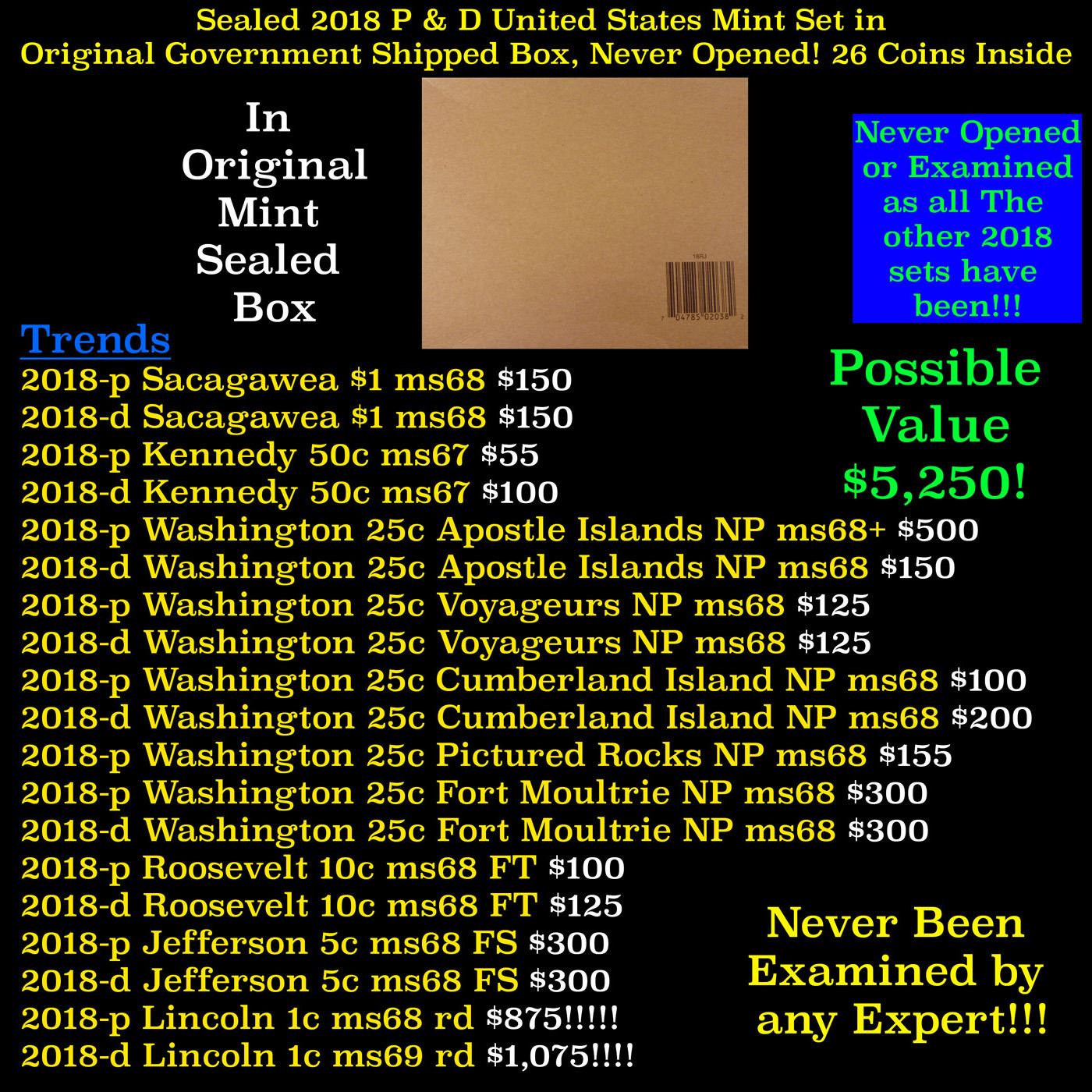 Sealed 2018 United States Mint Set in Original Government Shipped Box, Never Opened! 20 Coins Inside!. The 2018 United States Mint Uncirculated Coin Set® contains two folders of 10 coins each, one from the United States Mint at Philadelphia and the other from the United States Mint at Denver, for a total of 20 coins. Each folder includes these 2018-dated coins with uncirculated finishes: Five quarters from the America the Beautiful Quarters® Program honoring Pictured Rocks National Lakeshore in Michigan; Apostle Islands National Lakeshore in Wisconsin; Voyageurs National Park in Minnesota; Cumberland Island National Seashore in Georgia; and Block Island National Wildlife Refuge in Rhode Island. One Native American $1 Coin with a reverse design depicting Jim Thorpe, with the foreground elements highlighting his football and Olympic achievements. Inscriptions are “JIM THORPE,” “WA-THO-HUK” (his native name), “UNITED STATES OF AMERICA,” and “$1.” One Kennedy half dollar One Roosevelt dime One Jefferson nickel One Lincoln penny
