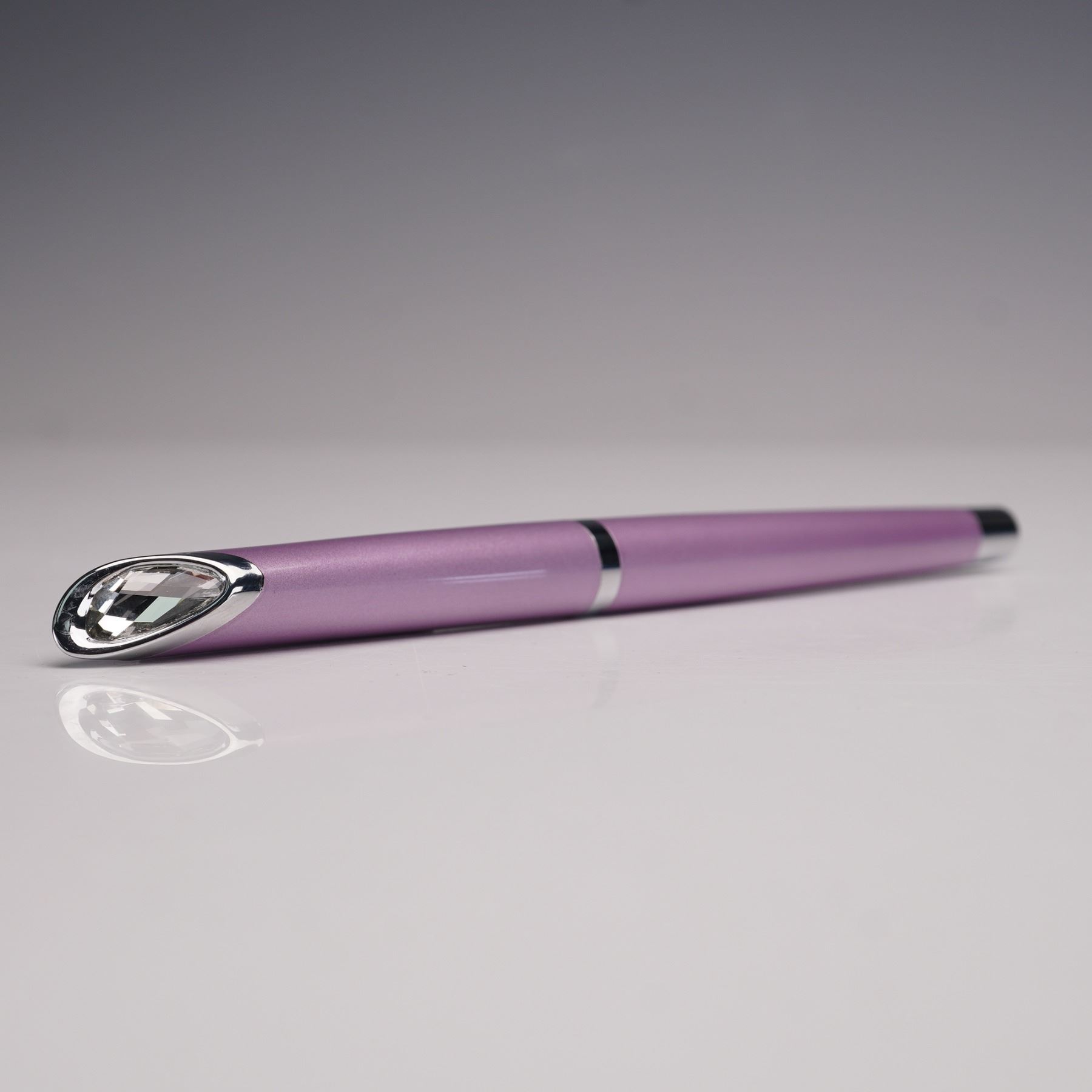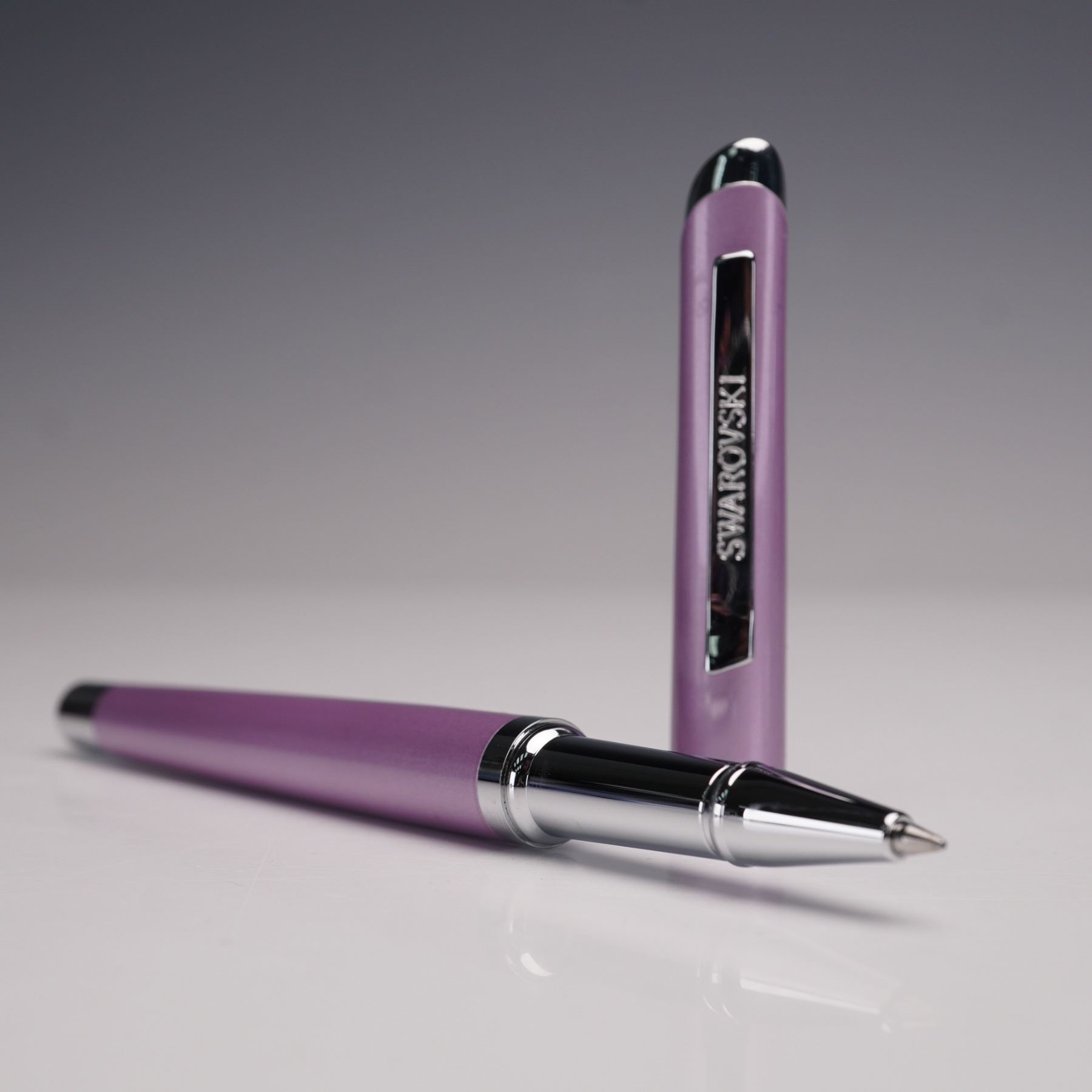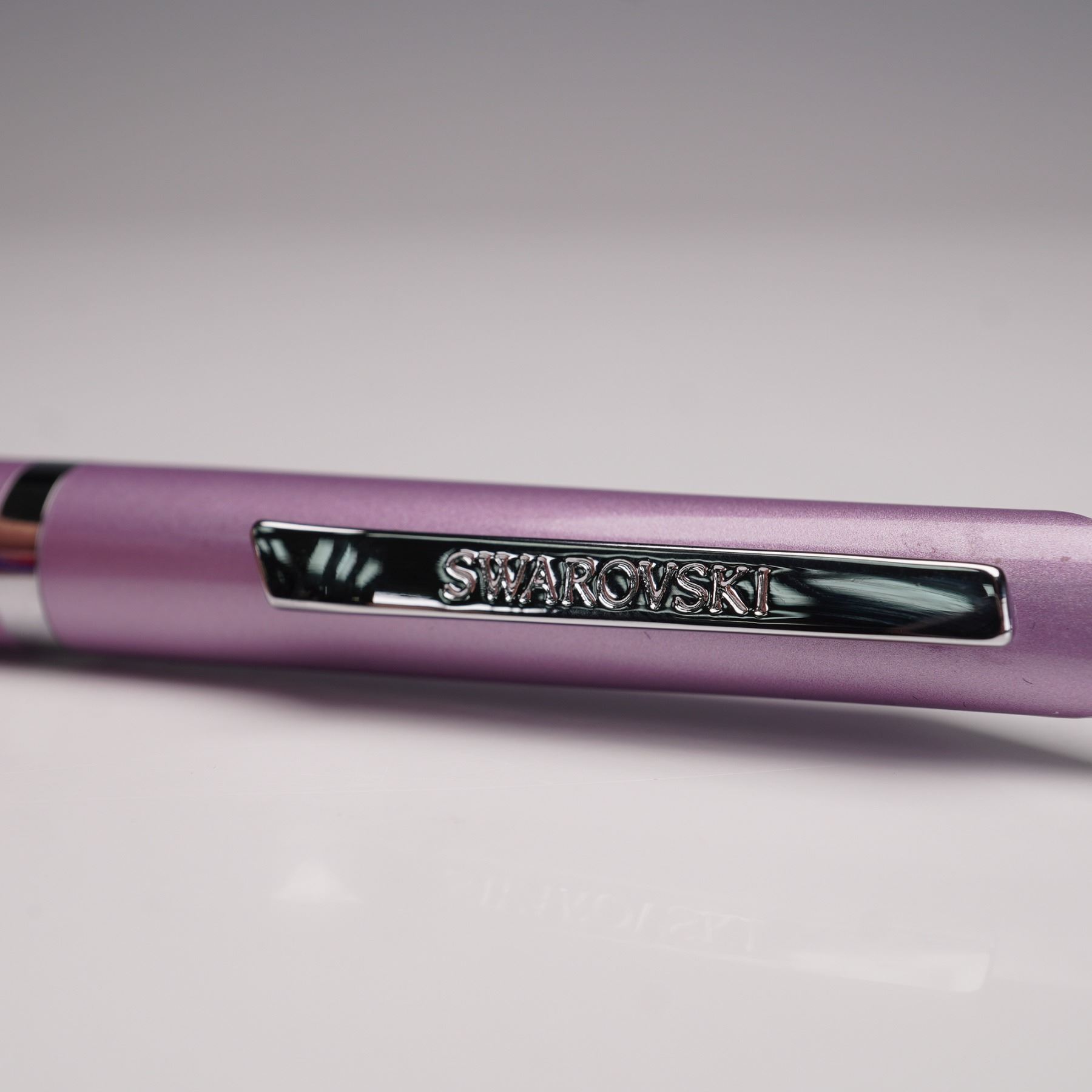 This pair includes one elegant lavender pen with a smooth finish accented by silver toned details and a faceted crystal on the clip for a touch of brilliance. The second pen remains factory sealed and is labeled as blue, and features silver toned details and a barrel filled with clear sparkling crystals. Swarovski backstamp. Marked 5281116. Marked 5281126. Largest item measures: 1.25"L x 0.5"W x 7.75"H.
