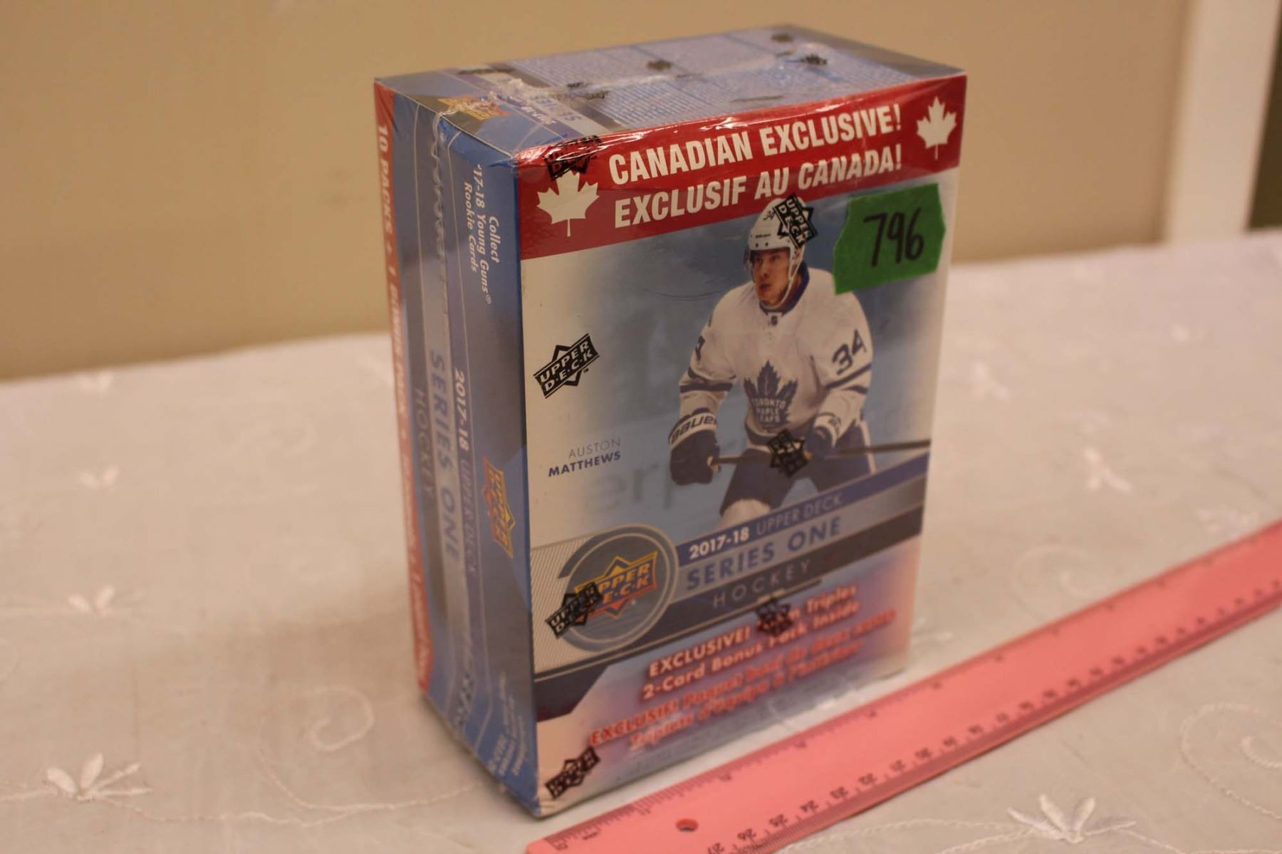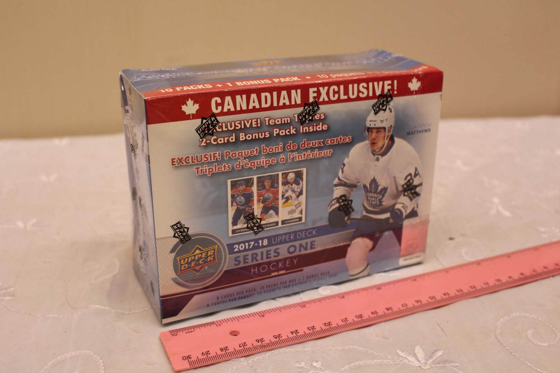 Sealed Box of 2017-18 Upper Deck Series One Hockey Cards, 11 Packs; look for “Young Guns Rookie Cards” & “Exclusive Team Triples Cards”!