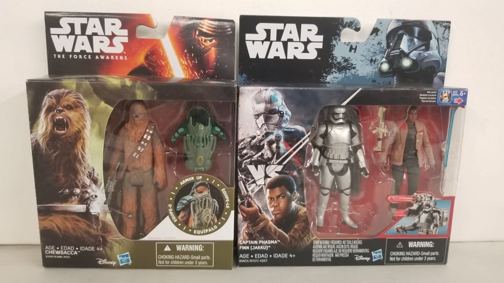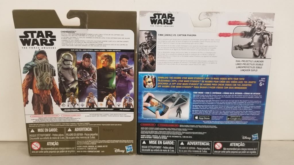 First is a 2015 sealed Chewbacca figure in good pre-owned condition. Packaging has some creases, dings, and light wear. Includes figure + 2 accessories. Next is a 2016 sealed box including 2 figures: Finn (Jakku) vs